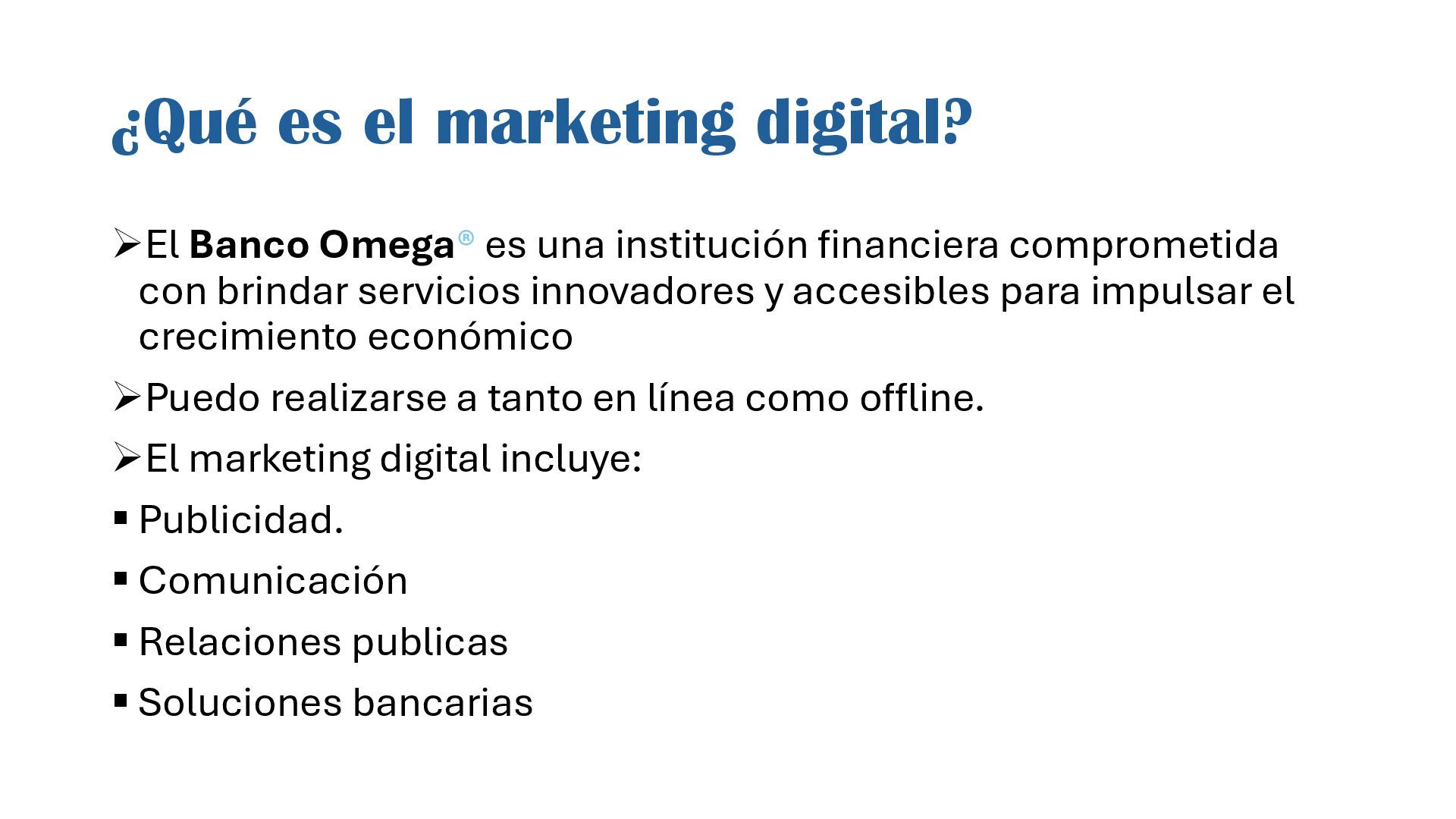 institución financiera comprometida con brindar servicios innovadores y accesibles para impulsar el crecimiento económico ➢Puedo realizarse a tanto en línea como offline. ➢El marketing digital incluye: ▪ Publicidad. ▪ Comunicación ▪ Relaciones publicas ▪ Soluciones bancarias