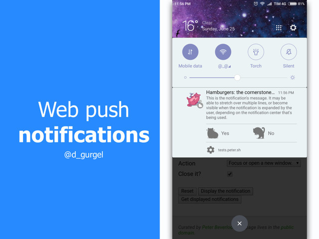 [email protected]', vapidKeys.publicKey, vapidKeys.privateKey ); const pushSubscription = { endpoint:”https://android.googleapis.com/gcm/send/ewcFEKglM…”, keys:{ p256dh:”BERT29SHqILHUjCaeN8NJMRXL8oQSQs…”, auth:"gzOk5sX1HTtfXb4PmVoiFA==" } } ☁ const payload = { title: 'Frontend meetup', message: ':) ', };