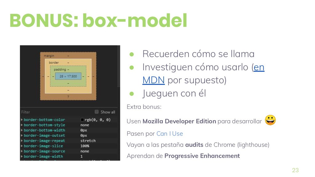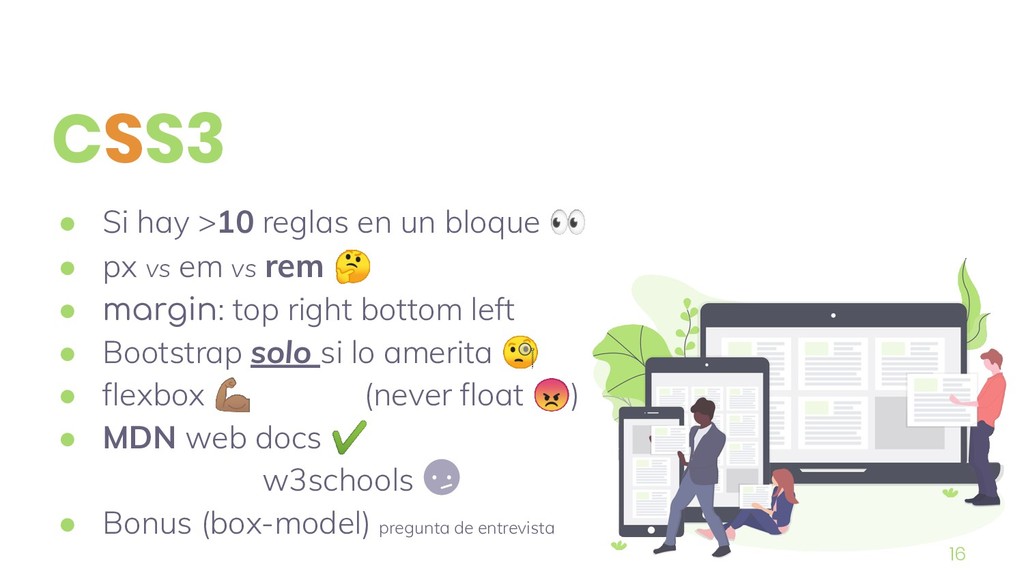 px vs em vs rem • margin: top right bottom left • Bootstrap solo si lo amerita • flexbox (never float ) • MDN web docs ✔ w3schools • Bonus (box-model) pregunta de entrevista 16