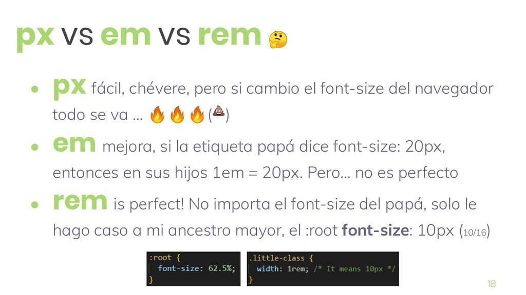 pero si cambio el font-size del navegador todo se va … () • em mejora, si la etiqueta papá dice font-size: 20px, entonces en sus hijos 1em = 20px. Pero… no es perfecto • rem is perfect! No importa el font-size del papá, solo le hago caso a mi ancestro mayor, el :root font-size: 10px (10/16 )