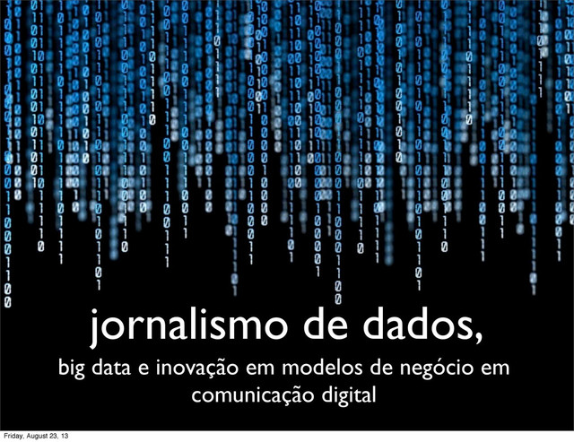 A apresentação faz um overview sobre o atual cenário tecnológico (era de dados), mostra possibilidades acerca de um jornalismo baseado em dados e processos computacionais automatizados, mas tem a sua função principal de discutir que a maior crise do jornalismo na atualidade encontra-se em seu conservador modelo de negócios e inércia em relação à inovação nesse contexto.