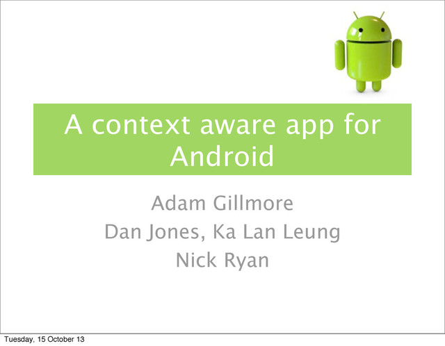 server • No location history tracked and all location data deleted at end of session • Successfully restrict location sharing to specified people, times and locations • Google’s latest location API includes – Fused location provider Tuesday, 15 October 13