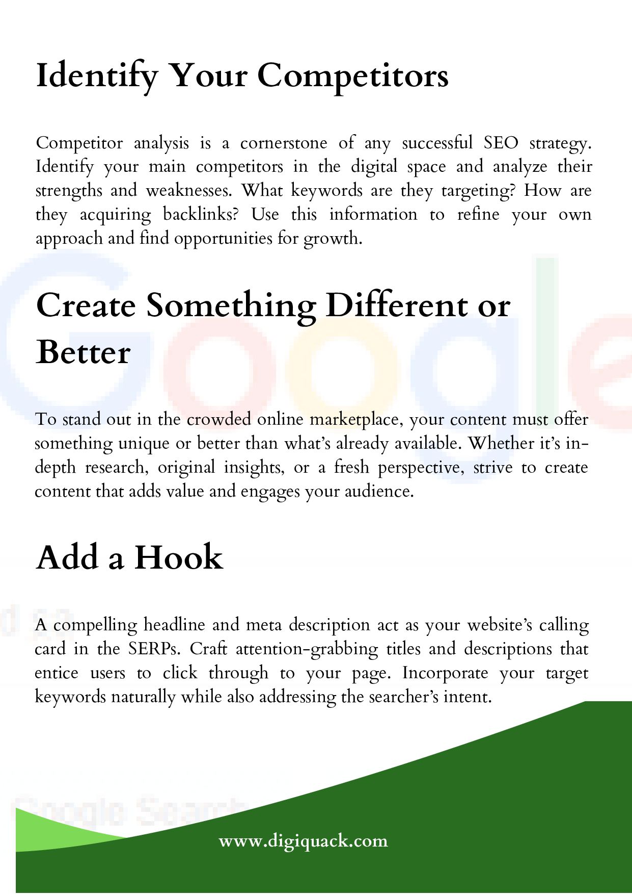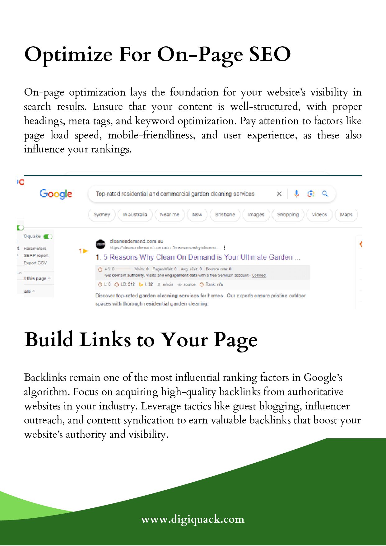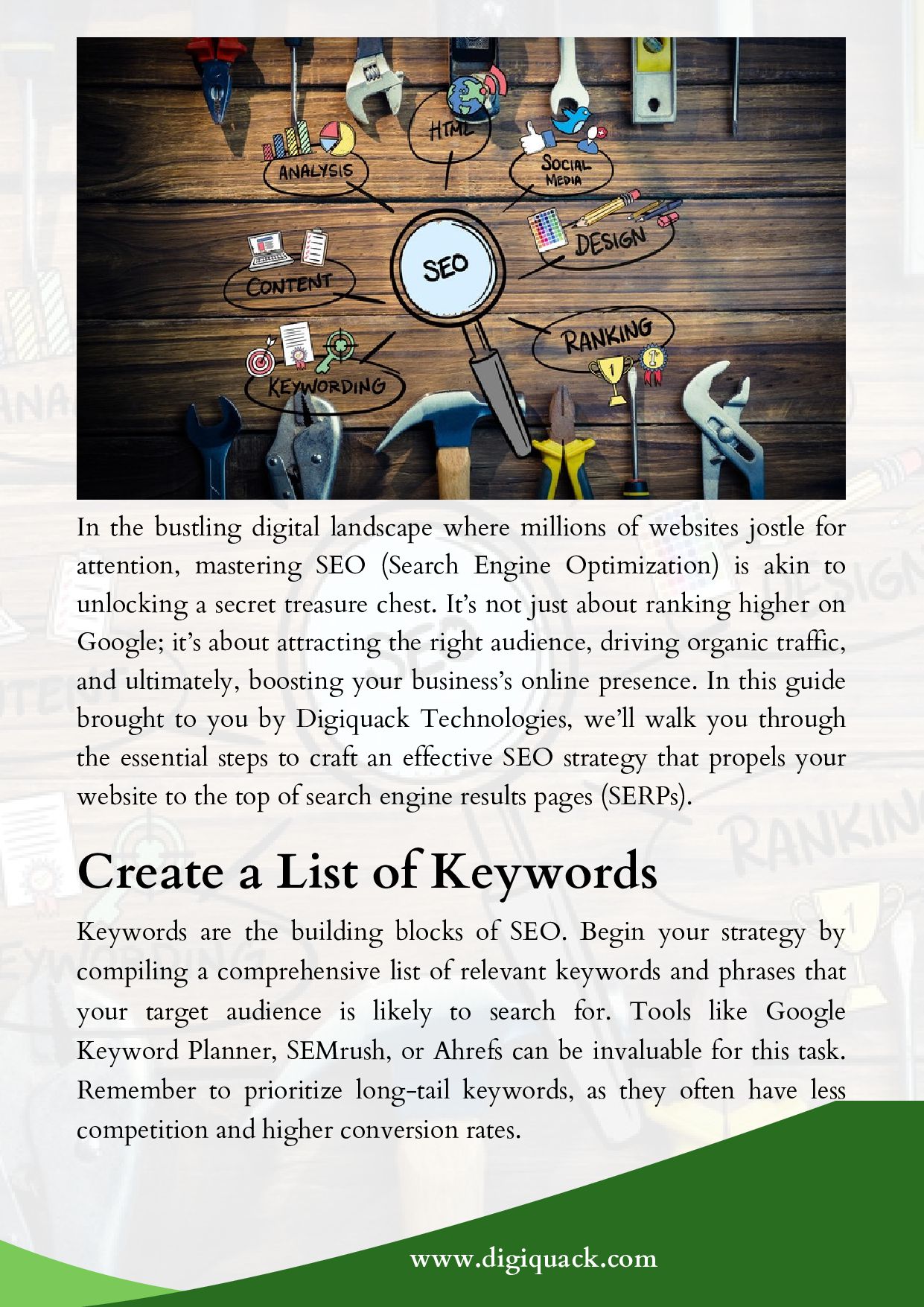 Digiquack Technologies’ SEO Experts’ Tips Help You Attract the Right Audience, Drive Organic Traffic, and Boost Your Business’s Online Presence by Guiding You Through the Essential Steps to Craft an Effective SEO Strategy, Which Includes Creating a List of Keywords, Analyzing Google’s First Page, Identifying Your Competitors, Creating Something Different or Better, Adding a Hook, Optimizing for On-Page SEO, and More. For More Details, Visit Us https://digiquack.com/seo-strategy-how-to-create-an-effective-plan/