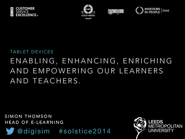 N H A N C I N G , E N R I C H I N G A N D E M P O W E R I N G O U R L E A R N E R S A N D T E A C H E R S . TA B L E T D E V I C E S @ d i g i s i m # s o l s t i c e 2 0 1 4 S I M O N T H O M S O N H E A D O F E - L E A R N I N G