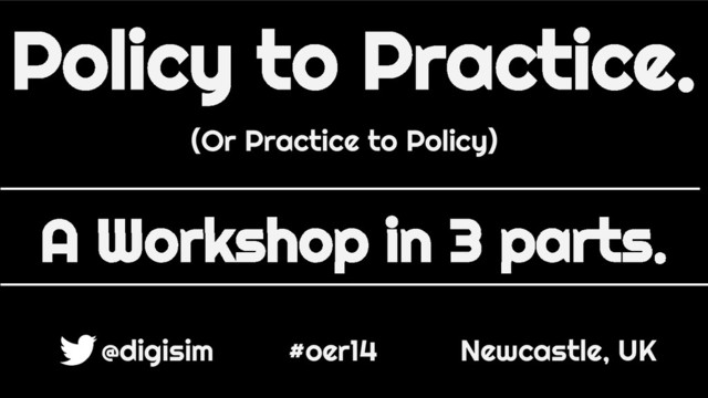 In this workshop we explored whether having an OER policy was the driver for sustaining OER activity. The presenter argues that "practice" is more important than policy. We also created a "fortune teller" device to engage our colleagues in discussion around OER.