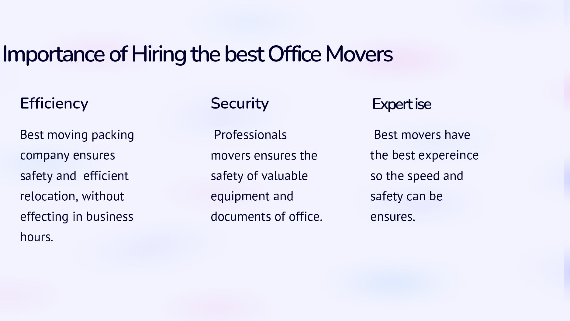 ise Best moving packing company ensures safety and efficient relocation, without effecting in business hours. Professionals movers ensures the safety of valuable equipment and documents of office. Best movers have the best expereince so the speed and safety can be ensures.