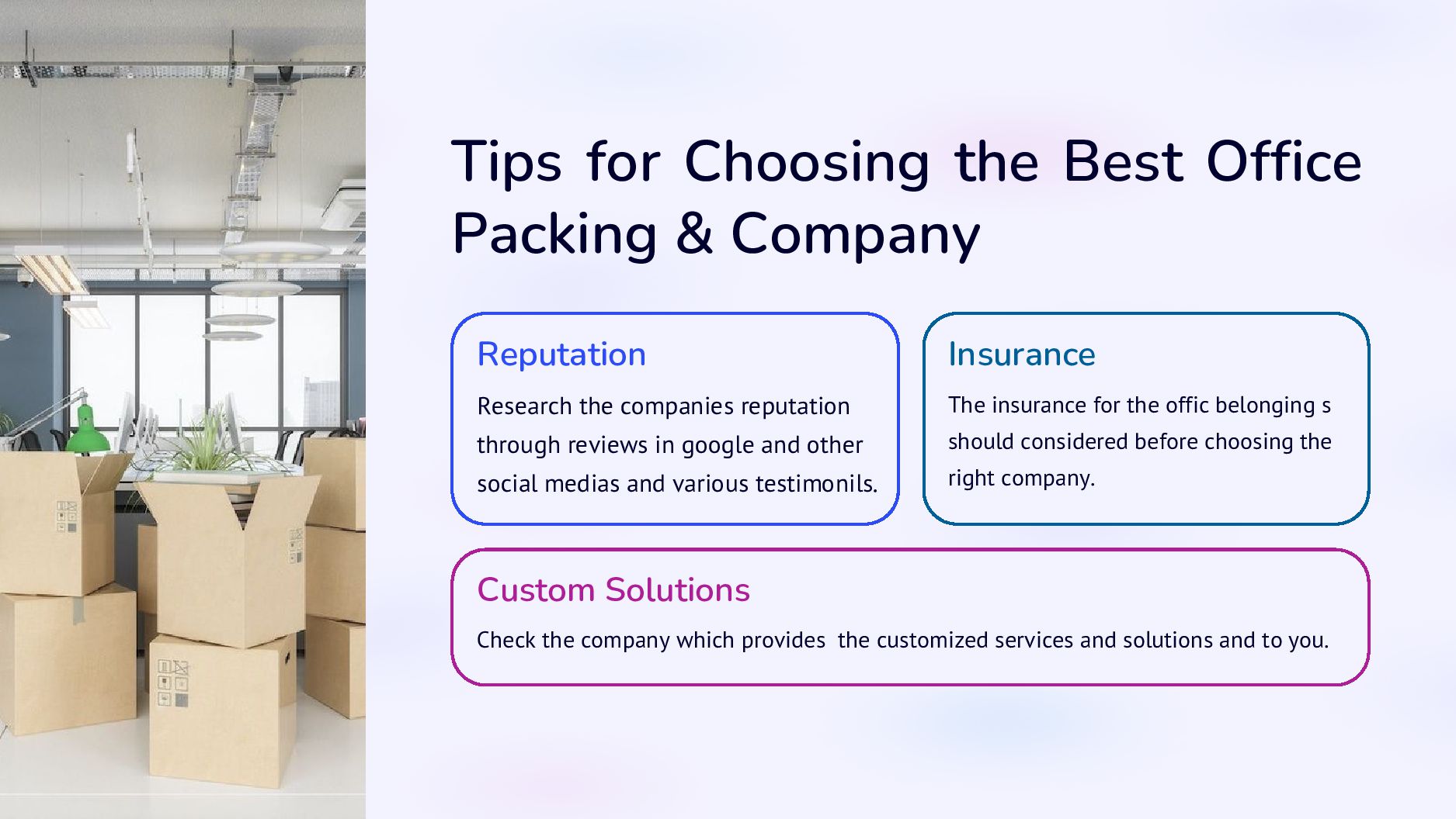 Custom Solutions Insurance Research the companies reputation through reviews in google and other social medias and various testimonils. Check the company which provides the customized services and solutions and to you. The insurance for the offic belonging s should considered before choosing the right company.