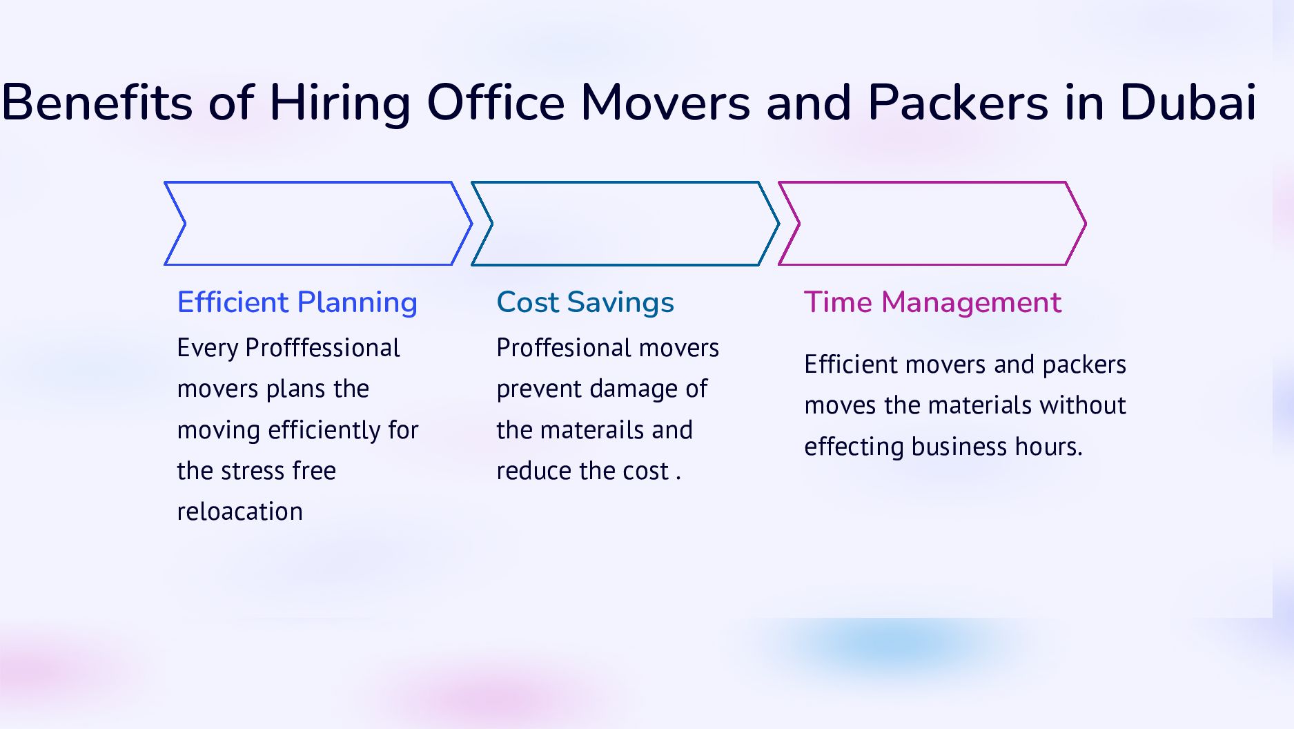 Planning Cost Savings Time Management Every Profffessional movers plans the moving efficiently for the stress free reloacation Proffesional movers prevent damage of the materails and reduce the cost . Efficient movers and packers moves the materials without effecting business hours.