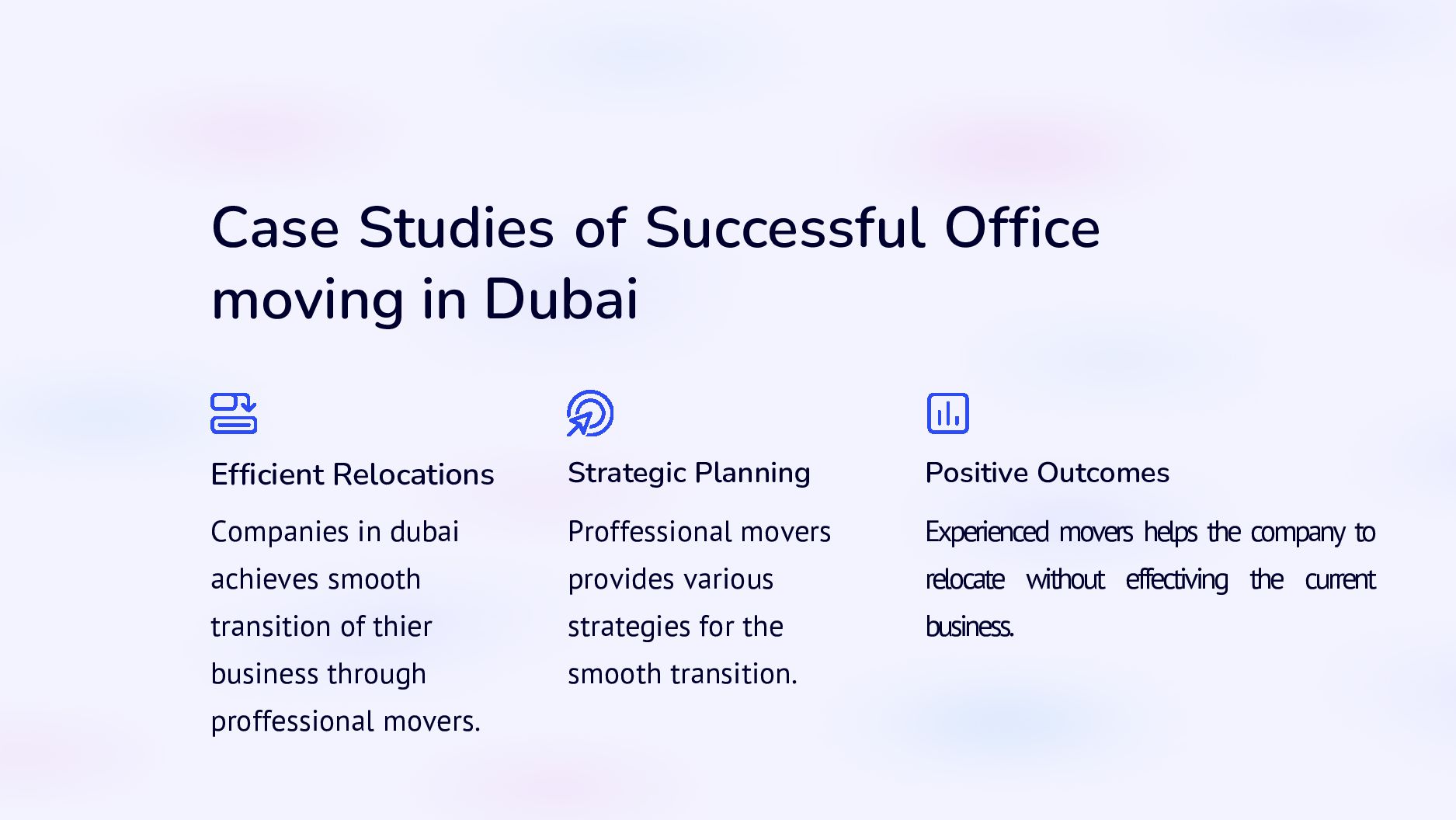 Strategic Planning Positive Outcomes Companies in dubai achieves smooth transition of thier business through proffessional movers. Proffessional movers provides various strategies for the smooth transition. Experienced movers helps the company to relocate without effectiving the current business.