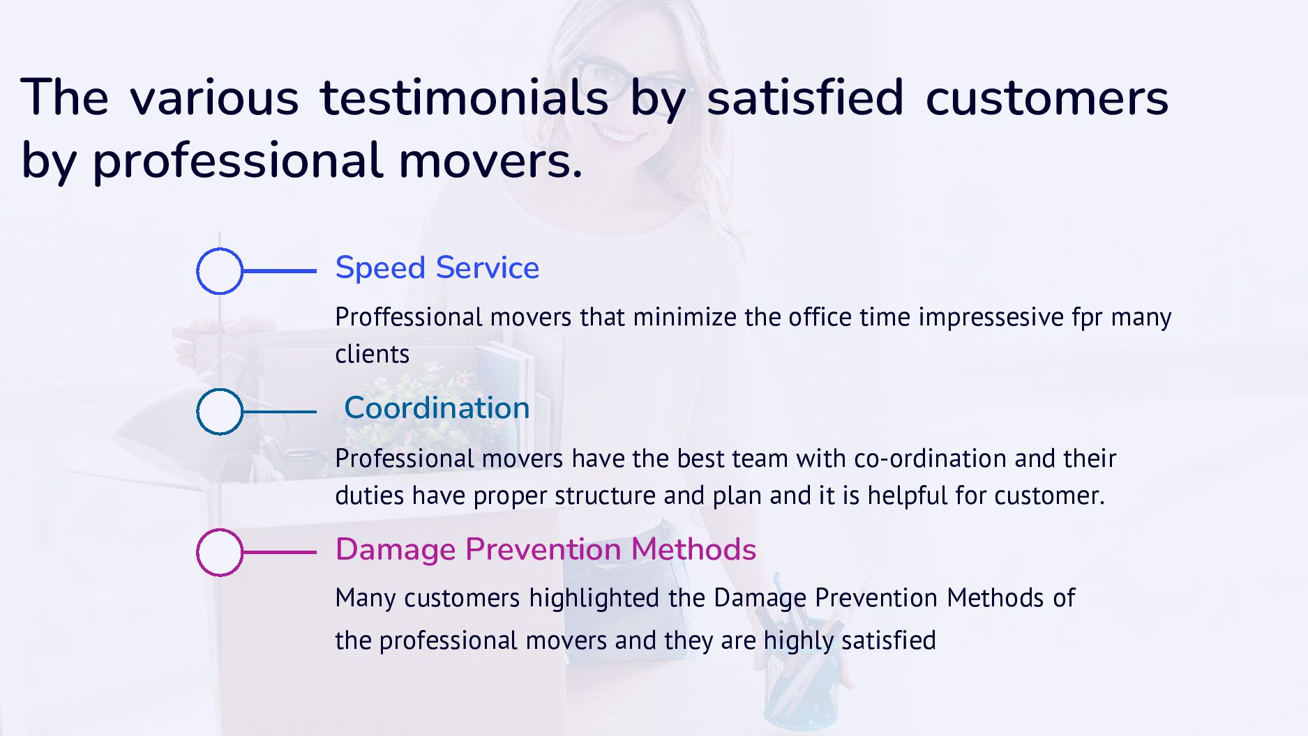 Service Damage Prevention Methods Coordination Proffessional movers that minimize the office time impressesive fpr many clients Professional movers have the best team with co-ordination and their duties have proper structure and plan and it is helpful for customer. Many customers highlighted the Damage Prevention Methods of the professional movers and they are highly satisfied
