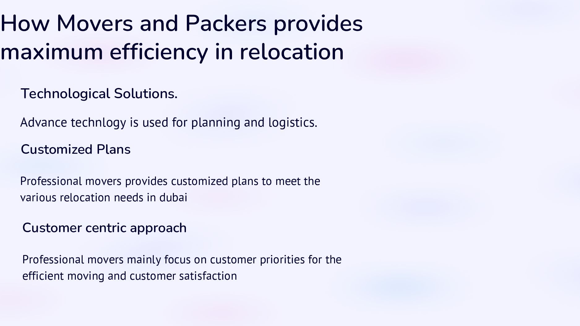 centric approach Customized Plans Advance technlogy is used for planning and logistics. Professional movers provides customized plans to meet the various relocation needs in dubai Professional movers mainly focus on customer priorities for the efficient moving and customer satisfaction Technological Solutions.