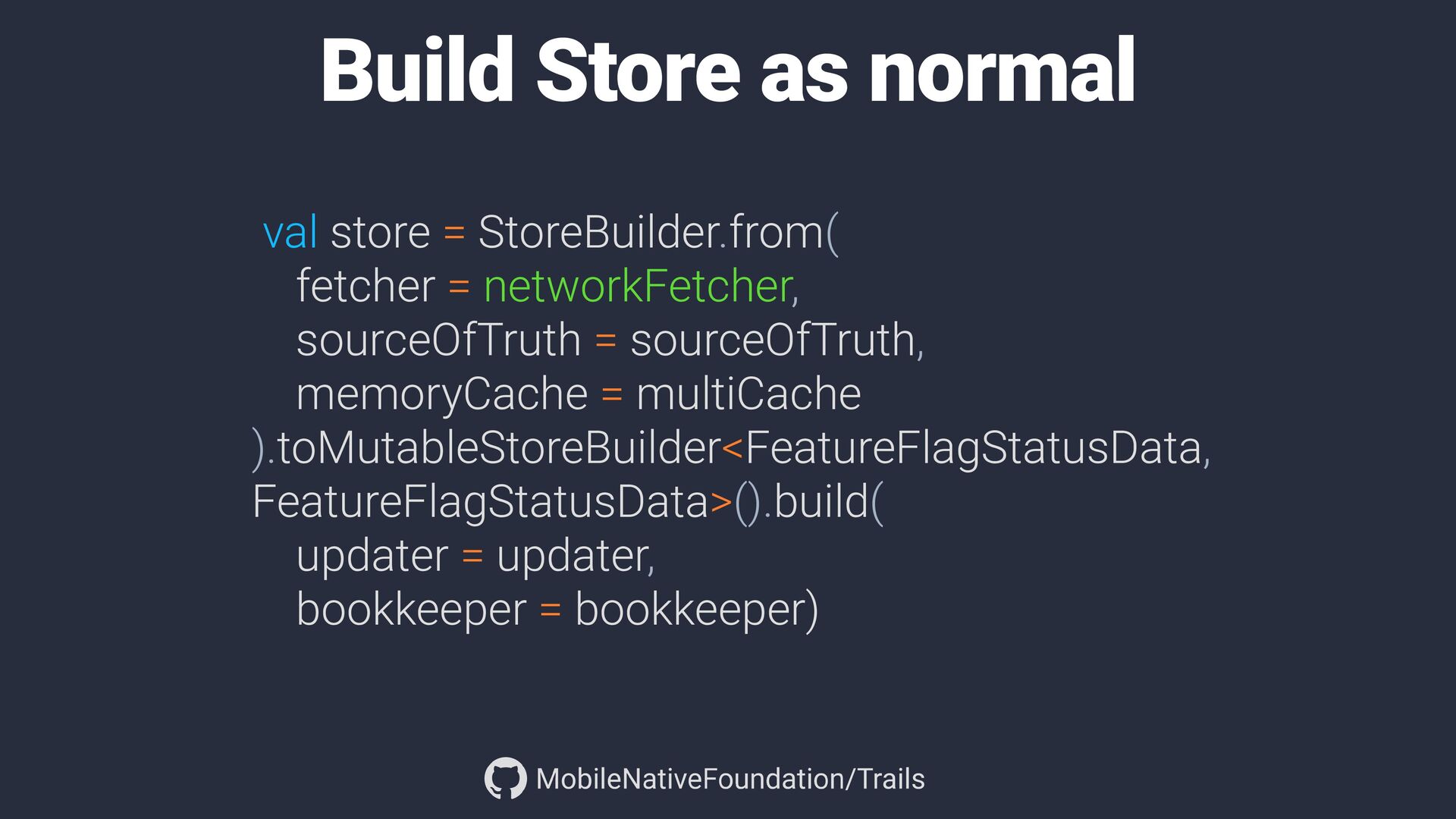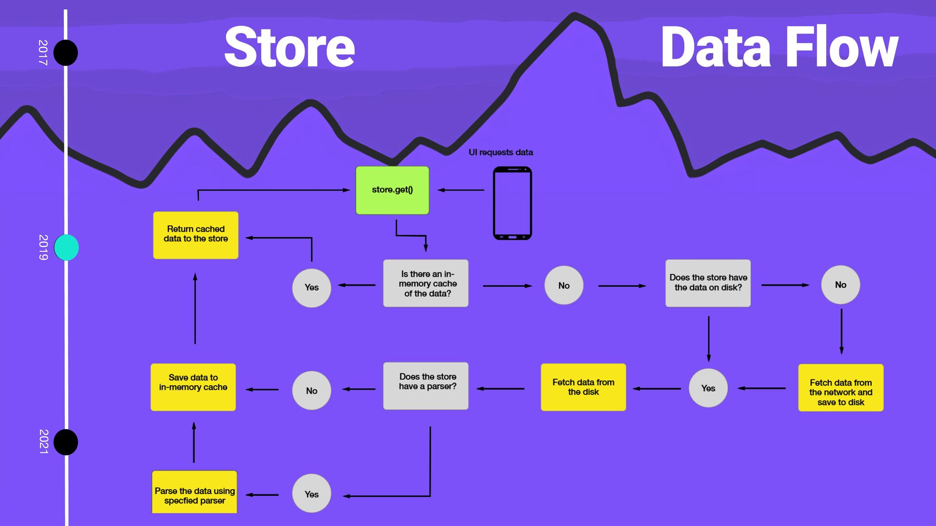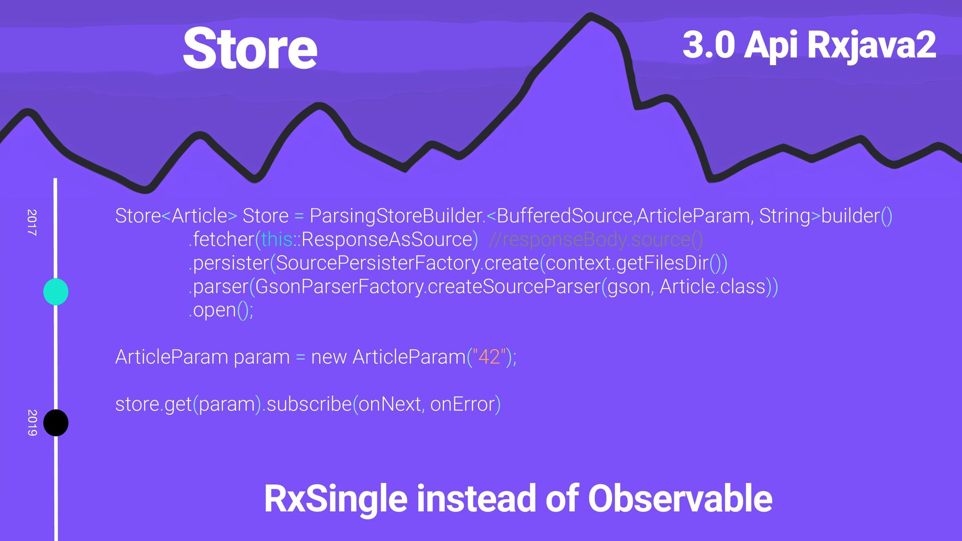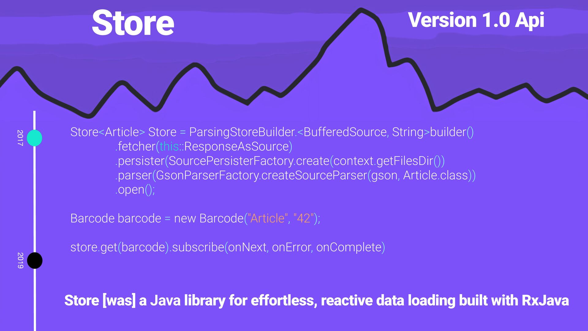 library for effortless, reactive data loading built with RxJava Store<Article> Store = ParsingStoreBuilder.<BufferedSource, String>builder() .fetcher(this::ResponseAsSource) .persister(SourcePersisterFactory.create(context.getFilesDir()) .parser(GsonParserFactory.createSourceParser(gson, Article.class)) .open(); Barcode barcode = new Barcode("Article", "42"); store.get(barcode).subscribe(onNext, onError, onComplete)