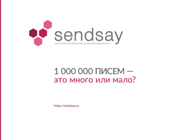 email-маркетинга • 16 лет на рынке рассылок • Свыше 10 млн писем/час • 99,9% доставляемость писем • Аттестат соответствия ФЗ №152 • Лицензия на предоставление телематических услуг связи Среди клиентов: Используя Sendsay, вы получаете надёжный, проверенный инструмент для создания качественных email-коммуникаций с клиентами.