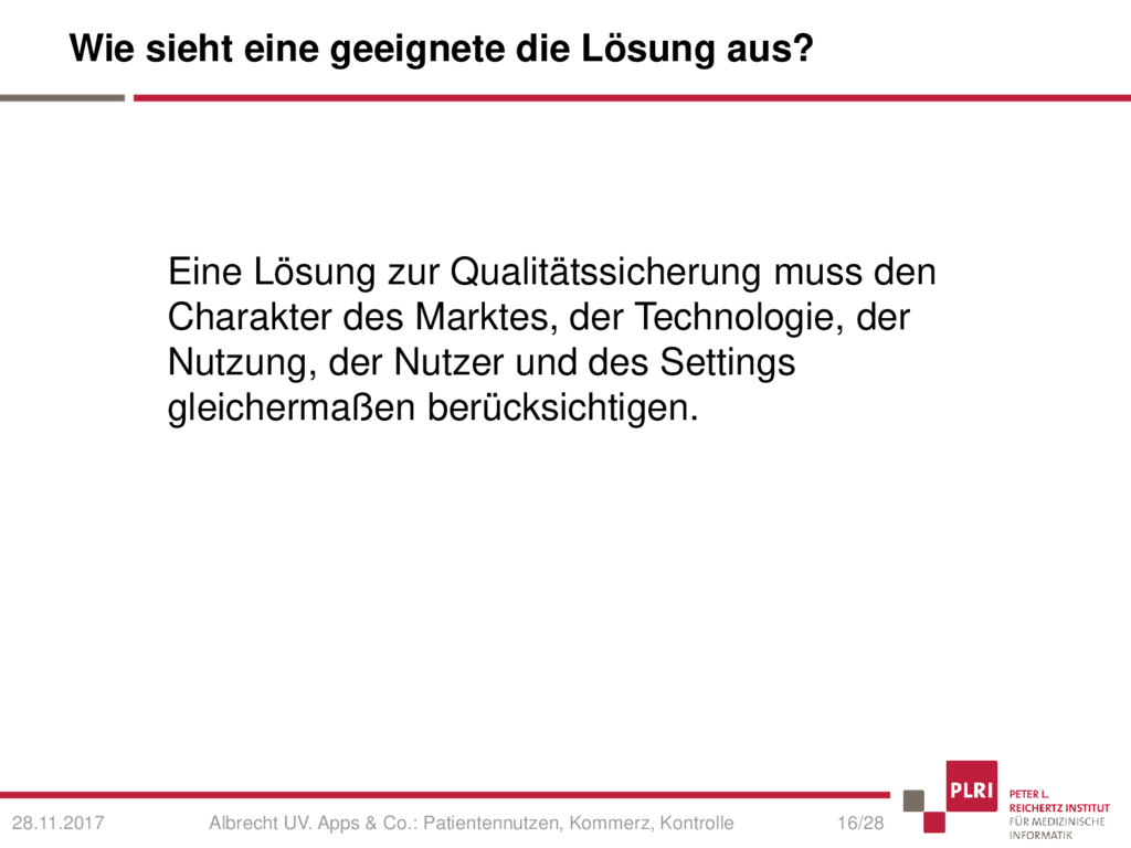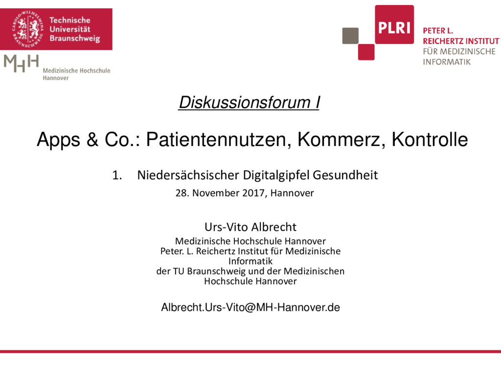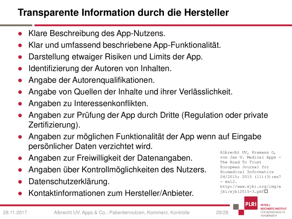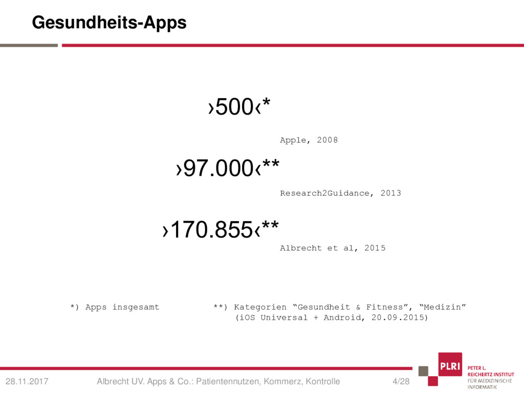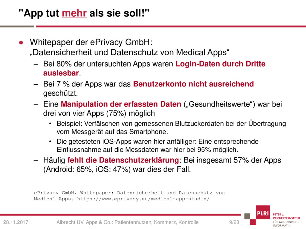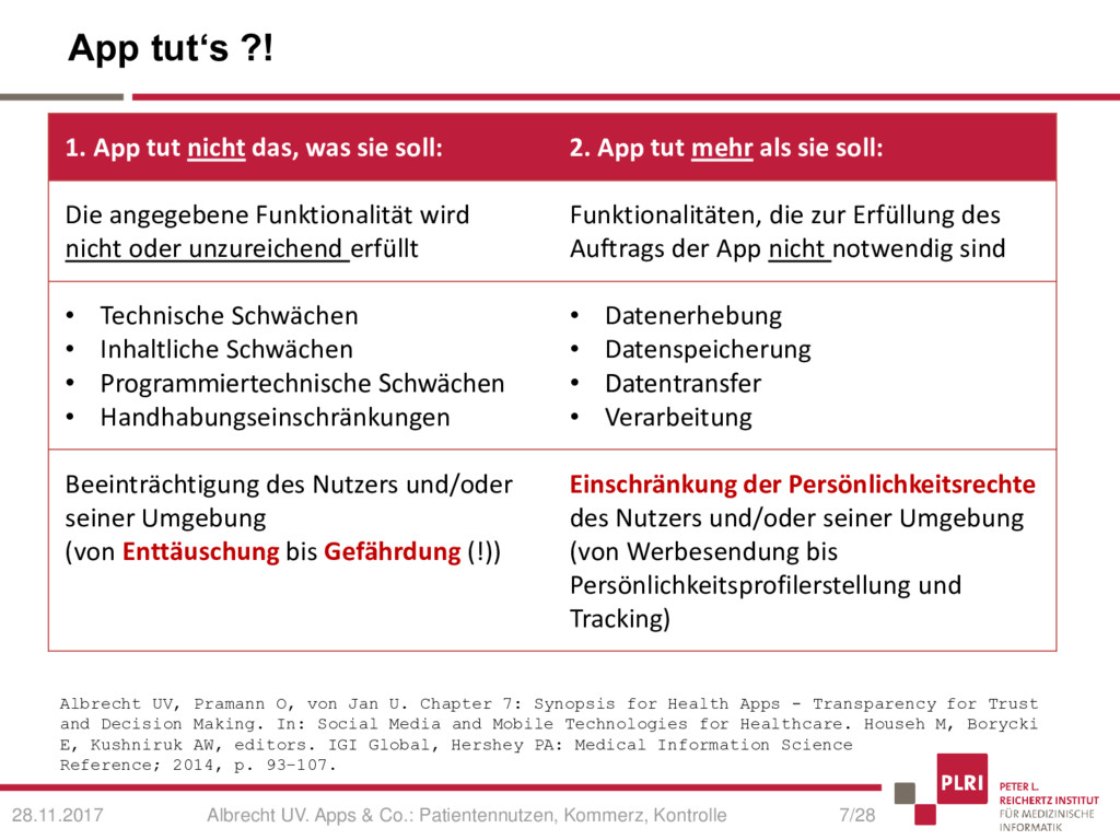 für Patienten, Reduktion klinischer Risiken. • Seltener Wiederholungen bereits durchgeführter Untersuchungen. • Bessere Versorgung der Patienten. • Optimierung von Behandlungspfaden. • mHealth: Zeit- und ortsunabhängiger Zugang zu den nötigen Patientendaten, Untersuchungsergebnissen, weiteren Informationen, … Behandlungsteams • Verbesserter Zugang zu Informationen der Patienten (Zeitersparnis, Entscheidungen können auf umfänglicheren Daten getroffen werden). • Verbesserungen bei der Kommunikation mit anderen Teammitgliedern. Patienten • Risikoreduktion bzgl. Behandlungsfehlern. • Reibungsloser Übergang bei sektorübergreifender Behandlung (z.B. Krankenhaus/Reha/Hausarzt). • Vermeidung doppelter Untersuchungen. • Vereinfachungen bei (erneuten) Verschreibungen, Medikationsplan, … • mHealth: Zeit- und ortsunabhängiger Zugang zu bzw. Erfassung eigener Gesundheitsdaten, gesundheitsbezogene Informationsrecherche, … Allgemeinheit • Reduktion von Kosten (Administration, Diagnostik und Behandlung). Abgewandelt nach: Factsheet „Der Nutzen von eHealth. eHealth Suisse, Koordinationsorgan Bund Kantone, http://www.e-health-suisse.ch, 2010 KBV. E-Health. Informationen zur digitalen Vernetzung, zur Finanzierung und zu gesetzlichen Vorgaben, 2017. http://www.kbv.de/media/sp/KBV_PraxisWissen_E_Health_2016.pdf 28.11.2017 6/28 Albrecht UV. Apps & Co.: Patientennutzen, Kommerz, Kontrolle
