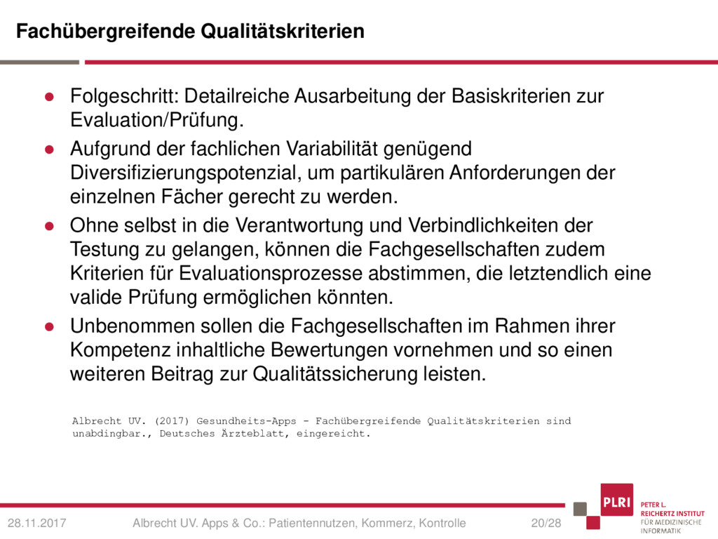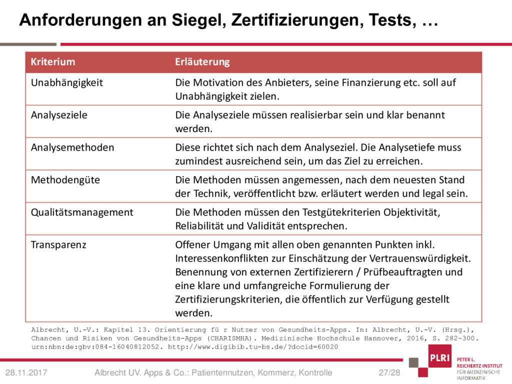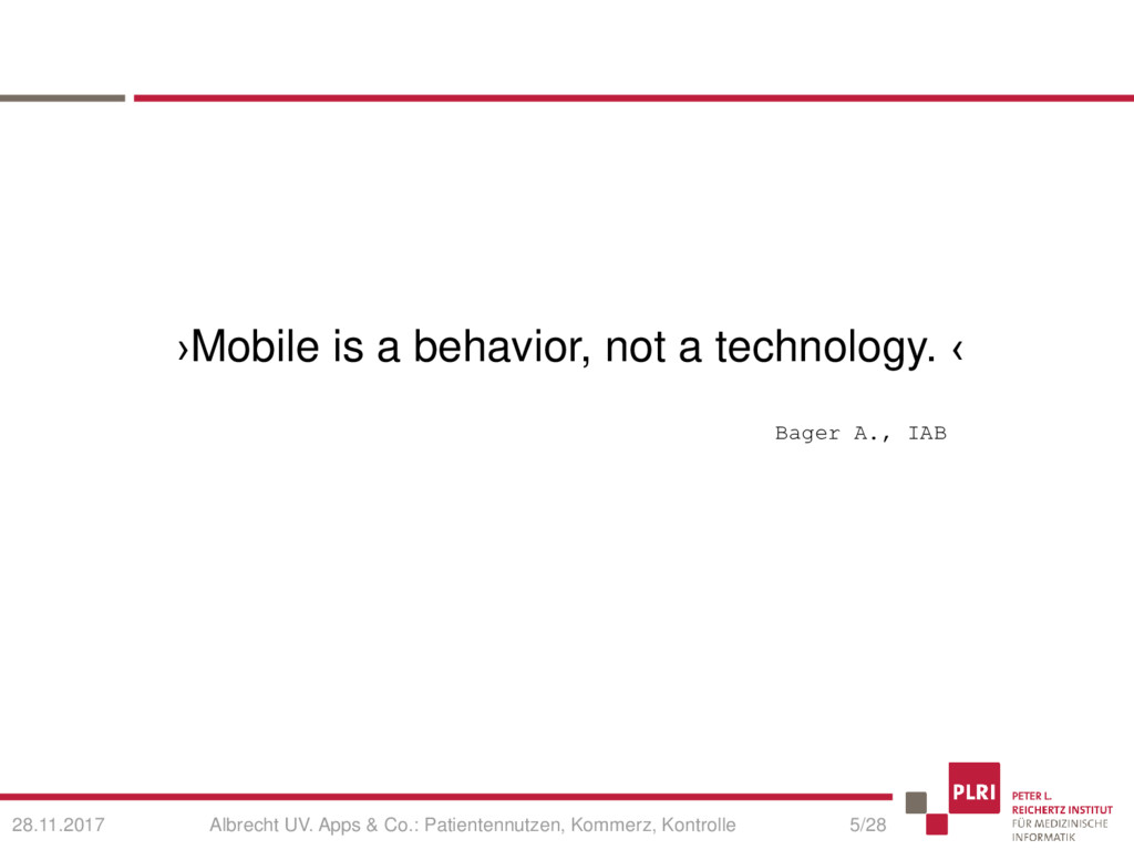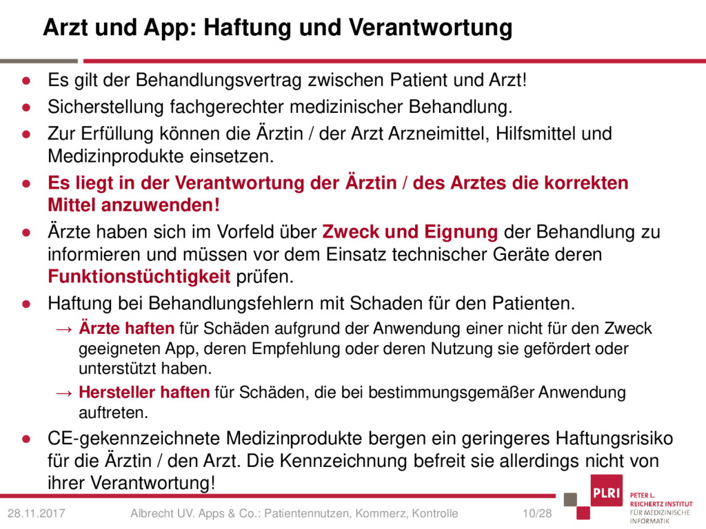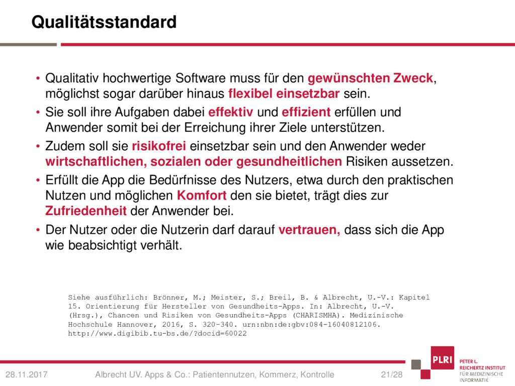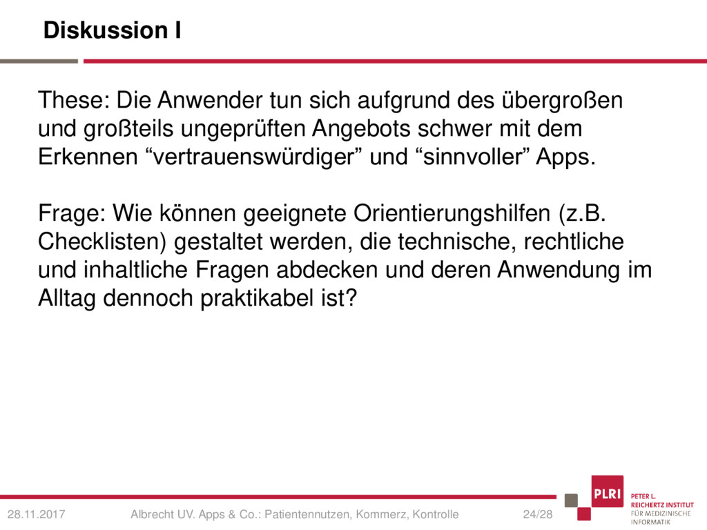 für Patienten, Reduktion klinischer Risiken. • Seltener Wiederholungen bereits durchgeführter Untersuchungen. • Bessere Versorgung der Patienten. • Optimierung von Behandlungspfaden. • mHealth: Zeit- und ortsunabhängiger Zugang zu den nötigen Patientendaten, Untersuchungsergebnissen, weiteren Informationen, … Behandlungsteams • Verbesserter Zugang zu Informationen der Patienten (Zeitersparnis, Entscheidungen können auf umfänglicheren Daten getroffen werden). • Verbesserungen bei der Kommunikation mit anderen Teammitgliedern. Patienten • Risikoreduktion bzgl. Behandlungsfehlern. • Reibungsloser Übergang bei sektorübergreifender Behandlung (z.B. Krankenhaus/Reha/Hausarzt). • Vermeidung doppelter Untersuchungen. • Vereinfachungen bei (erneuten) Verschreibungen, Medikationsplan, … • mHealth: Zeit- und ortsunabhängiger Zugang zu bzw. Erfassung eigener Gesundheitsdaten, gesundheitsbezogene Informationsrecherche, … Allgemeinheit • Reduktion von Kosten (Administration, Diagnostik und Behandlung). Abgewandelt nach: Factsheet „Der Nutzen von eHealth. eHealth Suisse, Koordinationsorgan Bund Kantone, http://www.e-health-suisse.ch, 2010 KBV. E-Health. Informationen zur digitalen Vernetzung, zur Finanzierung und zu gesetzlichen Vorgaben, 2017. http://www.kbv.de/media/sp/KBV_PraxisWissen_E_Health_2016.pdf 28.11.2017 6/28 Albrecht UV. Apps & Co.: Patientennutzen, Kommerz, Kontrolle
