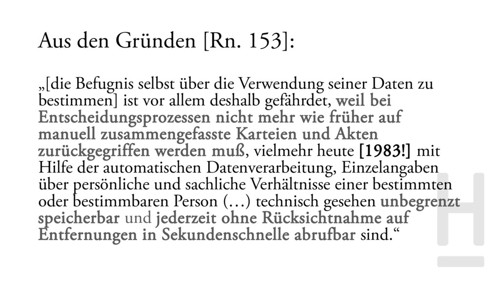 Verwendung seiner Daten zu bestimmen] ist vor allem deshalb gefährdet, weil bei Entscheidungsprozessen nicht mehr wie früher auf manuell zusammengefasste Karteien und Akten zurückgegriffen werden muß, vielmehr heute [1983!] mit Hilfe der automatischen Datenverarbeitung, Einzelangaben über persönliche und sachliche Verhältnisse einer bestimmten oder bestimmbaren Person (…) technisch gesehen unbegrenzt speicherbar und jederzeit ohne Rücksichtnahme auf Entfernungen in Sekundenschnelle abrufbar sind.“