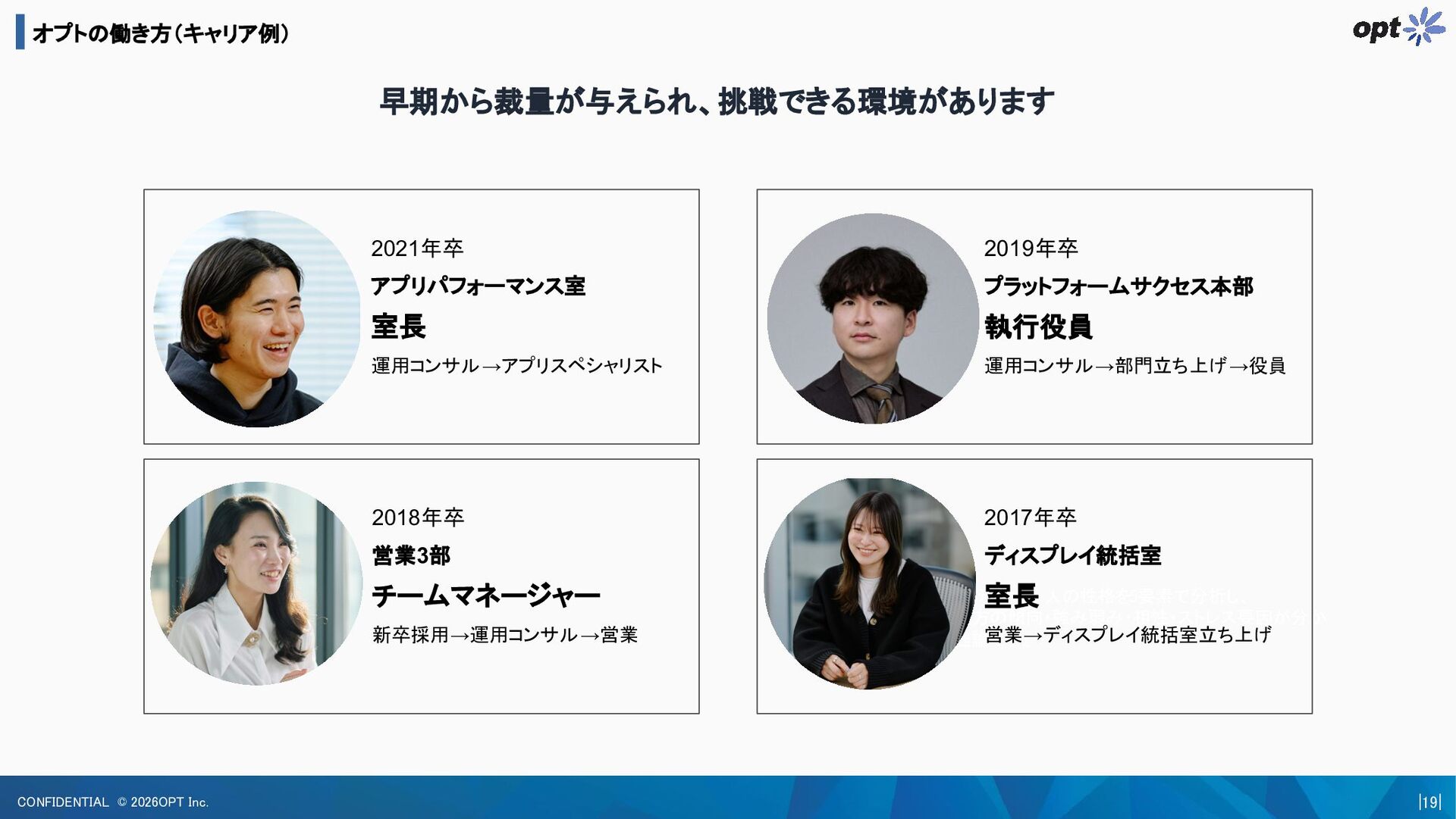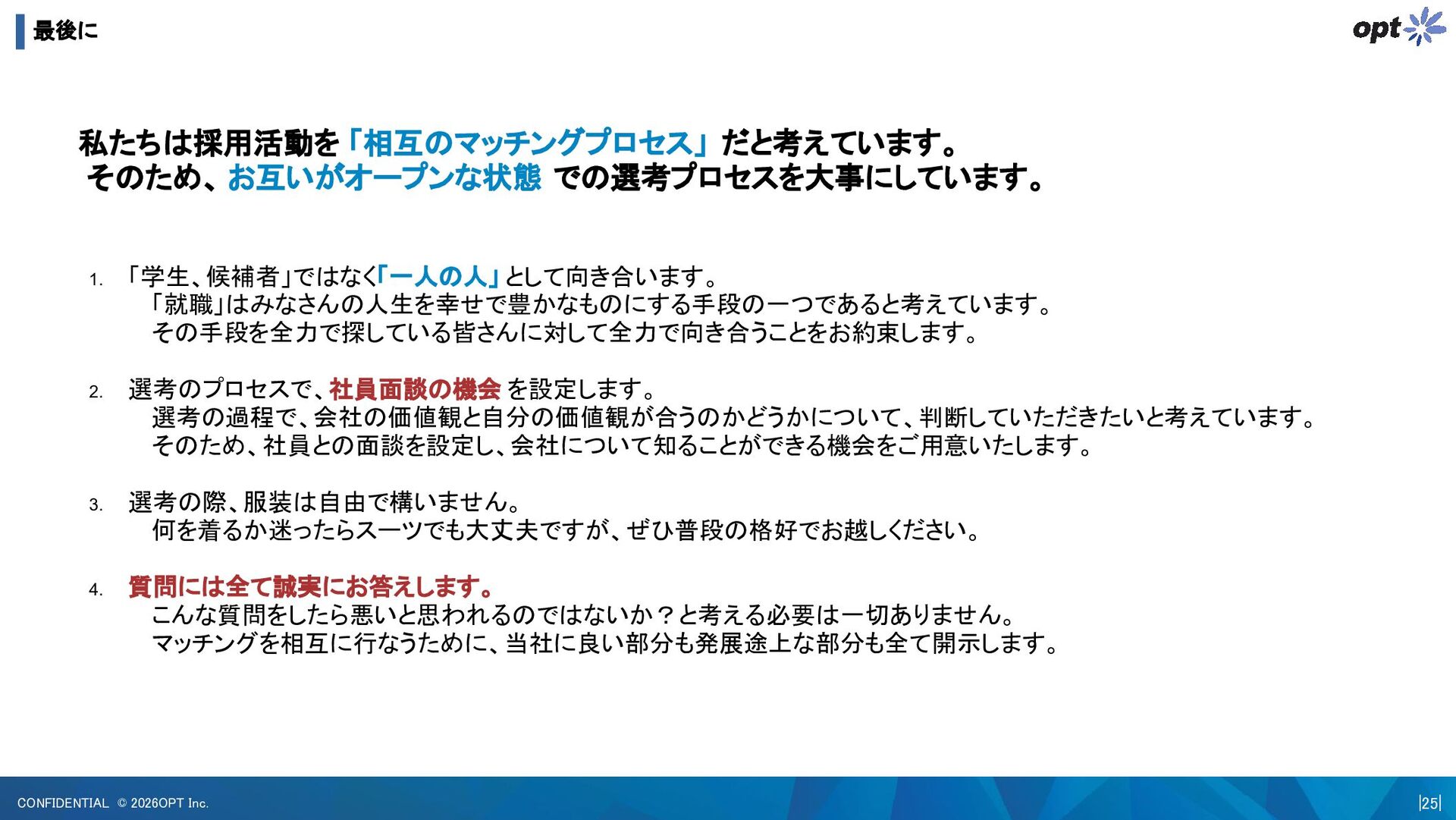 お互いがオープンな状態 での選考プロセスを大事にしています。 1. 「学生、候補者」ではなく「一人の人」 として向き合います。 「就職」はみなさんの人生を幸せで豊かなものにする手段の一つであると考えています。 その手段を全力で探している皆さんに対して全力で向き合うことをお約束します。 2. 選考のプロセスで、社員面談の機会 を設定します。 選考の過程で、会社の価値観と自分の価値観が合うのかどうかについて、判断していただきたいと考えています。 そのため、社員との面談を設定し、会社について知ることができる機会をご用意いたします。 3. 選考の際、服装は自由で構いません。 何を着るか迷ったらスーツでも大丈夫ですが、ぜひ普段の格好でお越しください。 4. 質問には全て誠実にお答えします。 こんな質問をしたら悪いと思われるのではないか?と考える必要は一切ありません。 マッチングを相互に行なうために、当社に良い部分も発展途上な部分も全て開示します。