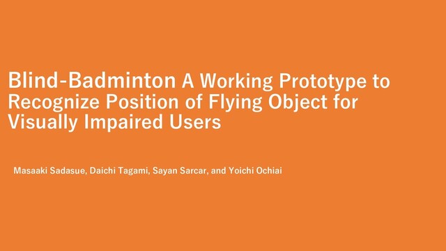 Masaaki Sadasue, Daichi Tagami, Sayan Sarcar, Yoichi Ochiai. (2021) Blind-Badminton. In: Antona M., Stephanidis C. (eds) Universal Access in Human-Computer Interaction. Access to Media, Learning and Assistive Environments. HCII 2021. Lecture Notes in Computer Science, vol 12769. Springer, Cham. https://doi.org/10.1007/978-3-030-78095-1_36