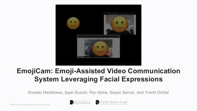 Kosaku Namikawa, Ippei Suzuki, Ryo Iijima, Sayan Sarcar, Yoichi Ochiai. (2021) EmojiCam: Emoji-Assisted Video Communication System Leveraging Facial Expressions. In: Kurosu M. (eds) Human-Computer Interaction. Design and User Experience Case Studies. HCII 2021. Lecture Notes in Computer Science, vol 12764. Springer, Cham.