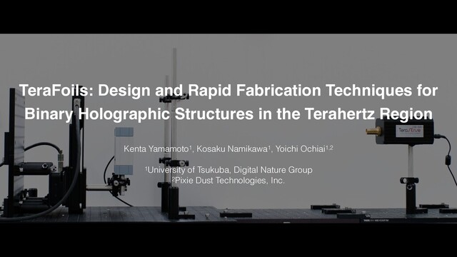 Kenta Yamamoto, Kosaku Namikawa, and Yoichi Ochiai. 2021. TeraFoils: Design and Rapid Fabrication Techniques for Binary Holographic Structures in the Terahertz Region. In ACM SIGGRAPH 2021 Poster (SIGGRAPH ’21). ACM, New York, NY, USA, Article 3, 2 pages. DOI: https://doi.org/10.1145/3450618.3469157 (to appear)