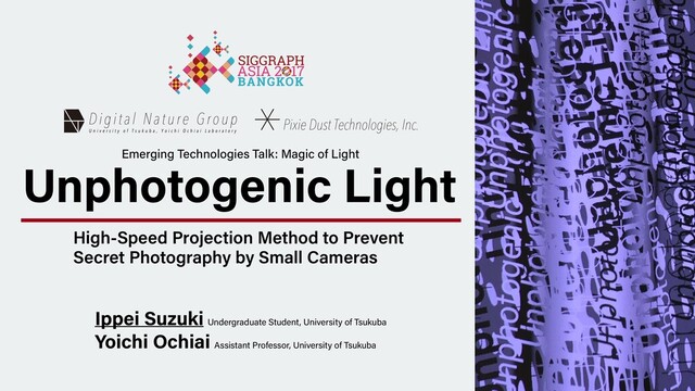 1. Unphotogenic Light High-Speed Projection Method to Prevent Secret Photography by Small Cameras Ippei Suzuki Undergraduate Student, University of Tsukuba Yoichi Ochiai Assistant Professor, University of Tsukuba Emerging Technologies Talk: Magic of Light