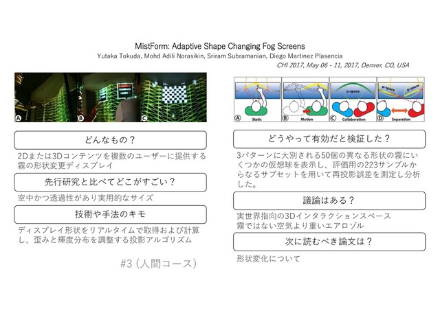 ,SJUJLB4IBSNB 1JZVTI#IBSEXBK BOESPJEͷεϚϗͷΧϝϥͰۭதͰͷεϫΠϓ ͢ΔΑ͏ͳδΣενϟʔΛೝࣝ͢ΔγεςϜ ޫྔͷٸܹͳมԽͷରԠ ॲཧೳྗ͕ݶΒΕ͍ͯΔϞόΠϧػثͰɺಈ తεϫΠϓδΣενϟʔͷೝࣝʹ͓͚Δਫ਼ ͰˋΛୡ [1] Song, J.,Soros, G. , Pece, F. , Fanello, S. , Izadi, S. , Keskin , C. &Hilliges , O. (2014). In-air Gestures Around Unmodified Mobile Devices. Proc.ACM UIST 2014. [2] Joshi, T. J. , Kumar, S. , Tarapore, N. Z. &Mohile, V. (2015). Static Hand Gesture Recognition using an Android Device.International Journal of Computer Applications(0975 – 8887) Volume 120, No. 21. [3] Rautaray, S. S. &Agrawal, A. (2012). Real Time Hand Gesture Recognition System for Dynamic Applications. International Journal of UbiComp (IJU), Vol.3, No.1. [15] Dixit, V. &Agrawal, A. (2015). Real-Time Hand Detection & Tracking for Dynamic Gesture Recognition. I.J. Intelligent Systtems and Applications. [16] Patil, T. B. , Jain, A. , Sawant, S. C. , Bhattacharyya, D. & Kim, H.J. (2016). Virtual Interactive Hand Gestures Recognition System in RealTime Environments. International Journal of Database Theory and Application, Vol.9, No.7 (2016), pp.39-50. *&&&b ΞϯυϩΠυσόΠεͷਖ਼໘ͷΧϝϥͰ̐ʙ̕ඵͷδΣ ενϟʔΛࡱӨ͠ɺॲཧʹཁ͢Δղ૾͕খ͍͞΄Ͳ εϐʔυ͕ߴԽ͍ͯ͠Δ͜ͱΛࣔͨ͠ ϦΞϧλΠϜܭࢉʹΑΔߦྻׂΓͯͷͨΊ ͷ0QFO$7ͷΞϓϦέʔγϣϯ