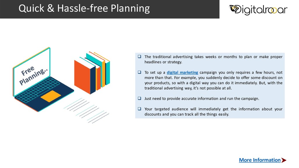 or months to plan or make proper headlines or strategy. To set up a digital marketing campaign you only requires a few hours, not more than that. For example, you suddenly decide to offer some discount on your products, so with a digital way you can do it immediately. But, with the traditional advertising way, it’s not possible at all. Just need to provide accurate information and run the campaign. Your targeted audience will immediately get the information about your discounts and you can track all the things easily. More Information