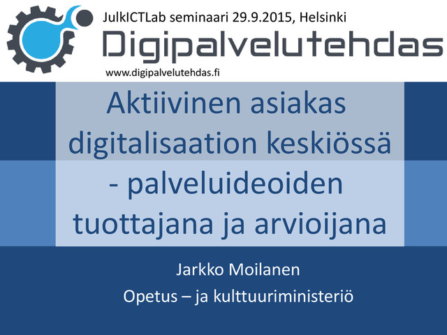 kuitenkaan ei orjallisesti • Paikallinen ”toimisto” – fasilitointi, yhteisömanagerointi, aktivoi paikallisia yrityksiä – voidaan käyttää alueellisten digitaalisten palveluiden kiihdyttämiseen • 6-8 alueellista Digipalvelutehdas toimistoa – Pirkanmaa valmis perustamaan heti Kampus Areenalle, Hervanta. Etenee jo rahoituksen haussa – Helsingissä vastaavan tyyppisen mallin rakennus – Oulussa ja Varsinais-Suomessa aloitettu keskustelut Alueellinen ulottuvuus
