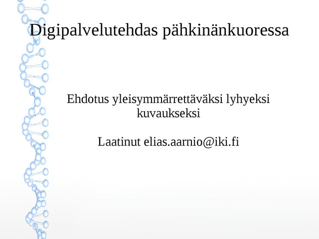 palvelu sen sijaan, että valittaisiin "sinne päin" olevista paras Kansalaiset = palvelun käyttäjät mukaan ideointiin, arviointiin ja toteutukseen Tehdään nopeasti "proof of concept"- toteutus, jonka perusteella jatko ratkeaa