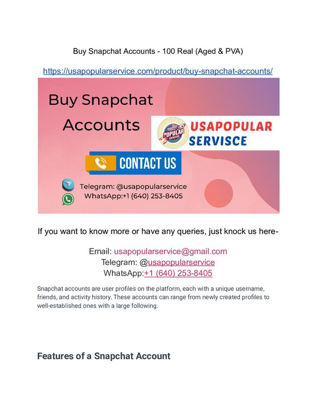 If you want to know more or have any queries, just knock us here- Email: [email protected] Telegram: @usapopularservice WhatsApp:+1 (640) 253-8405 Snapchat accounts are user profiles on the platform, each with a unique username, friends, and activity history. These accounts can range from newly created profiles to well-established ones with a large following. Features of a Snapchat Account