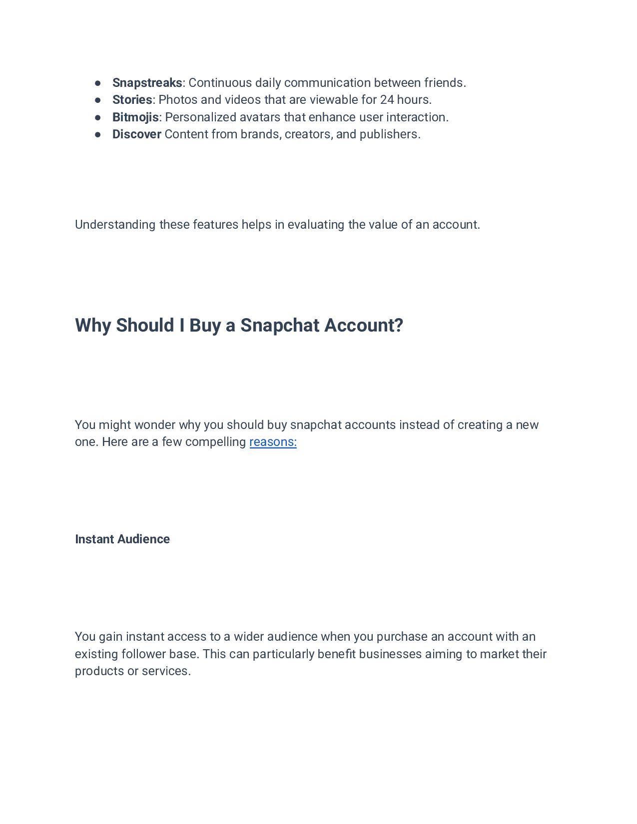 and videos that are viewable for 24 hours. • Bitmojis: Personalized avatars that enhance user interaction. • Discover Content from brands, creators, and publishers. Understanding these features helps in evaluating the value of an account. Why Should I Buy a Snapchat Account? You might wonder why you should buy snapchat accounts instead of creating a new one. Here are a few compelling reasons: Instant Audience You gain instant access to a wider audience when you purchase an account with an existing follower base. This can particularly benefit businesses aiming to market their products or services.