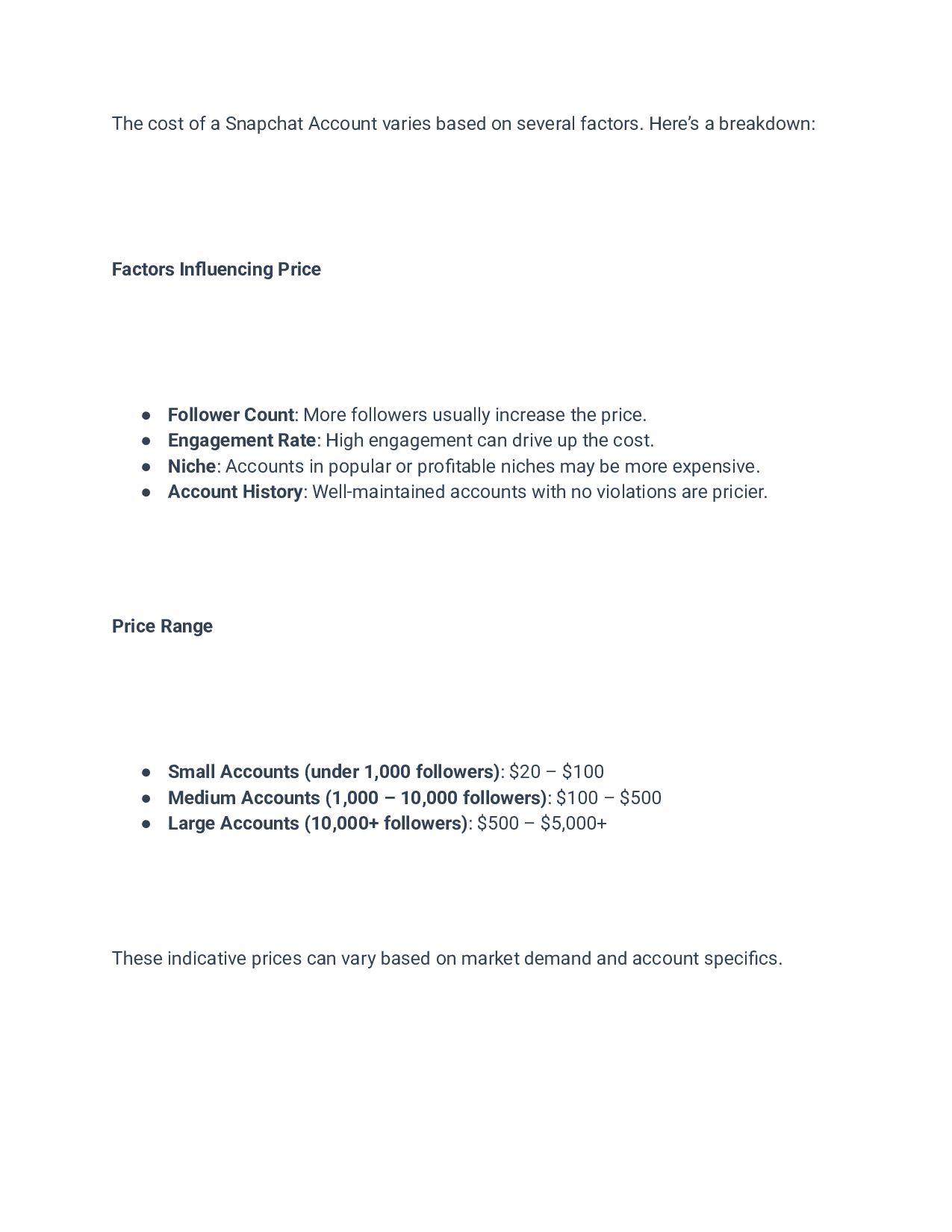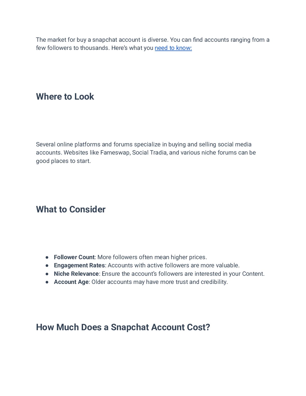 can find accounts ranging from a few followers to thousands. Here’s what you need to know: Where to Look Several online platforms and forums specialize in buying and selling social media accounts. Websites like Fameswap, Social Tradia, and various niche forums can be good places to start. What to Consider • Follower Count: More followers often mean higher prices. • Engagement Rates: Accounts with active followers are more valuable. • Niche Relevance: Ensure the account’s followers are interested in your Content. • Account Age: Older accounts may have more trust and credibility. How Much Does a Snapchat Account Cost?