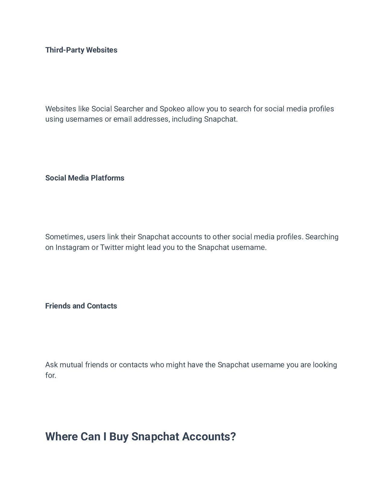 to search for social media profiles using usernames or email addresses, including Snapchat. Social Media Platforms Sometimes, users link their Snapchat accounts to other social media profiles. Searching on Instagram or Twitter might lead you to the Snapchat username. Friends and Contacts Ask mutual friends or contacts who might have the Snapchat username you are looking for. Where Can I Buy Snapchat Accounts?