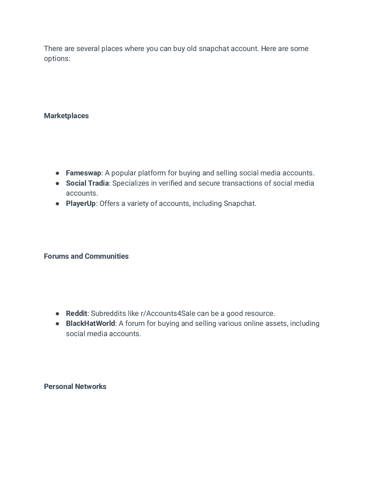 account. Here are some options: Marketplaces • Fameswap: A popular platform for buying and selling social media accounts. • Social Tradia: Specializes in verified and secure transactions of social media accounts. • PlayerUp: Offers a variety of accounts, including Snapchat. Forums and Communities • Reddit: Subreddits like r/Accounts4Sale can be a good resource. • BlackHatWorld: A forum for buying and selling various online assets, including social media accounts. Personal Networks