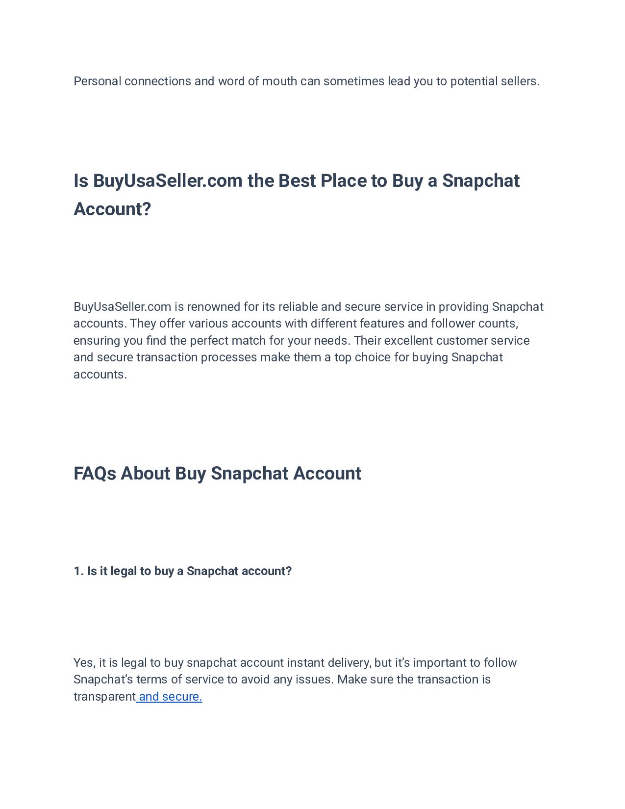 to potential sellers. Is BuyUsaSeller.com the Best Place to Buy a Snapchat Account? BuyUsaSeller.com is renowned for its reliable and secure service in providing Snapchat accounts. They offer various accounts with different features and follower counts, ensuring you find the perfect match for your needs. Their excellent customer service and secure transaction processes make them a top choice for buying Snapchat accounts. FAQs About Buy Snapchat Account 1. Is it legal to buy a Snapchat account? Yes, it is legal to buy snapchat account instant delivery, but it’s important to follow Snapchat’s terms of service to avoid any issues. Make sure the transaction is transparent and secure.