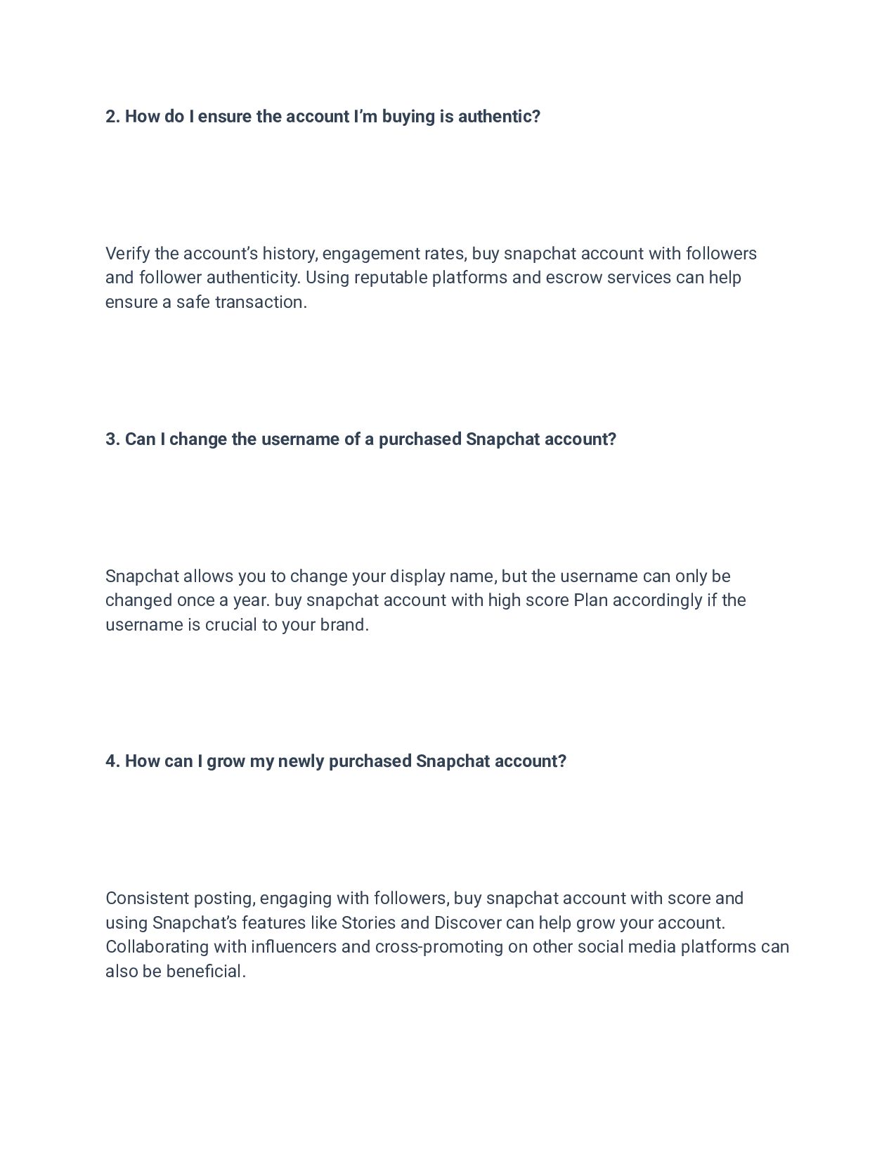 authentic? Verify the account’s history, engagement rates, buy snapchat account with followers and follower authenticity. Using reputable platforms and escrow services can help ensure a safe transaction. 3. Can I change the username of a purchased Snapchat account? Snapchat allows you to change your display name, but the username can only be changed once a year. buy snapchat account with high score Plan accordingly if the username is crucial to your brand. 4. How can I grow my newly purchased Snapchat account? Consistent posting, engaging with followers, buy snapchat account with score and using Snapchat’s features like Stories and Discover can help grow your account. Collaborating with influencers and cross-promoting on other social media platforms can also be beneficial.