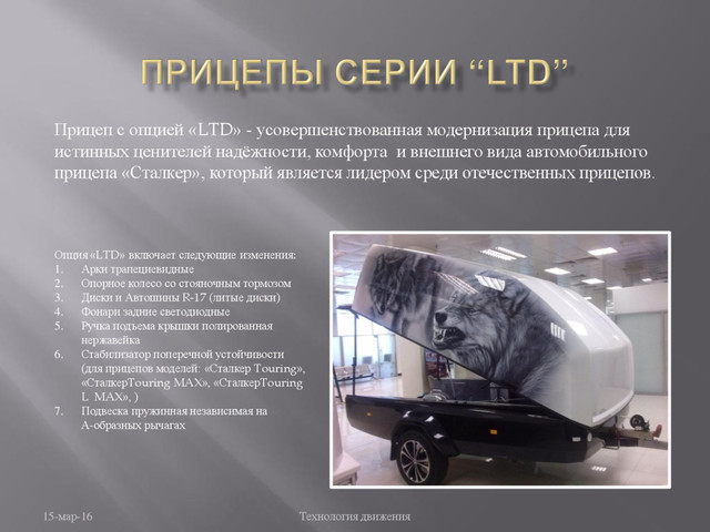 ценителей надёжности, комфорта и внешнего вида автомобильного прицепа «Сталкер», который является лидером среди отечественных прицепов. Опция «LTD» включает следующие изменения: 1. Арки трапециевидные 2. Опорное колесо со стояночным тормозом 3. Диски и Автошины R-17 (литые диски) 4. Фонари задние светодиодные 5. Ручка подъема крышки полированная нержавейка 6. Стабилизатор поперечной устойчивости (для прицепов моделей: «Сталкер Touring», «СталкерTouring MAX», «СталкерTouring L MAX», ) 7. Подвеска пружинная независимая на А-образных рычагах Технология движения 15-мар-16