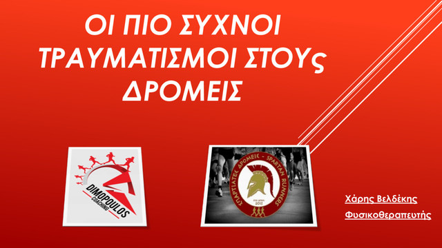 παθήσεις Κακώσεις : συμβαίνουν είτε από άμεση πλήξη(κύριως σε ομαδικά αθλήματα) είτε αποτελούν ρήξη κάποιου ιστού(π.χ. θλάση) Παθήσεις : συμβαίνουν μετά από συνεχή καταπόνηση και ονομάζονται σύνδρομα υπέρχρησης(π.χ. τενοντίτιδα) ε δρομικά αθλήματα συνήθως συναντάμε παθήσεις ύμφωνα με τη βιβλιογραφία στους δρομείς οι τραυματισμοί κυμαίνονται από 2,5 έως 12,1/1000 ώρες προπόνησης ε δρομείς σύντομων αποστάσεων(έως 42χλμ) υπάρχει κίνδυνος εμφάνισης και κακώσεων (εκτός από παθήσεων) ενώ σε δρομείς υπεραπόστασης παρατηρούνται περισσότερο σύνδρομα υπέρχρησης λόγω των φορτίων και των καταπονήσεων που δέχονται Οι τραυματισμοί με τους οποίους θα ασχοληθούμε έχουν κοινό χαρακτηριστικό ότι είναι σύνδρομα υπέρχρησης και μπορούν να προληφθούν μέσω ασκήσεων ενδυνάμωσης ή καλής αποθεραπείας