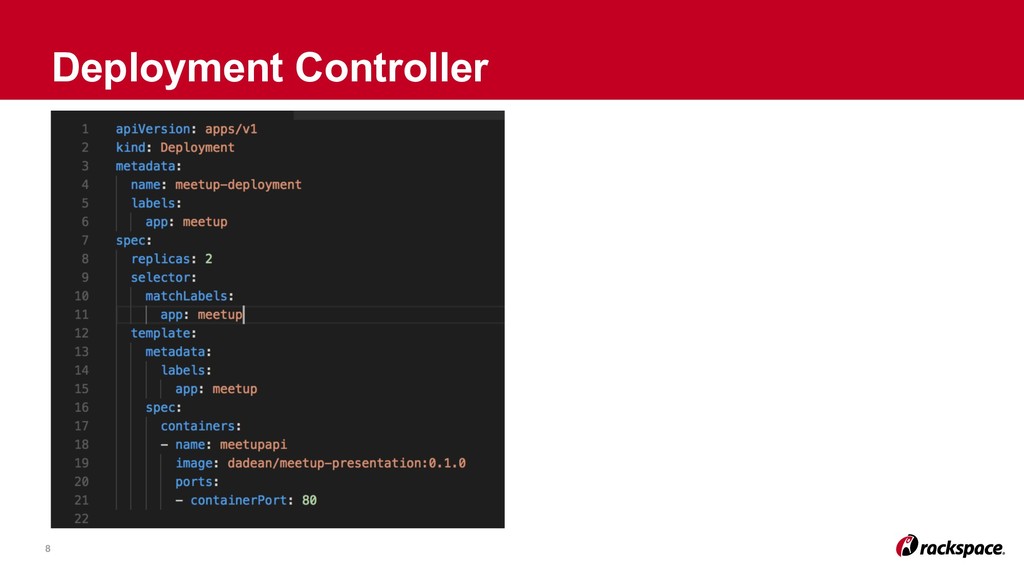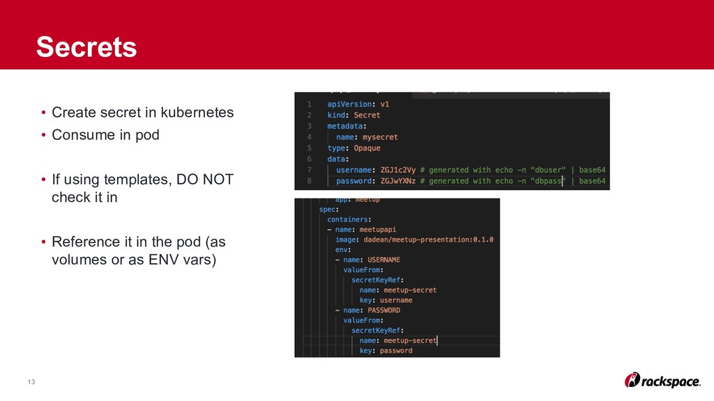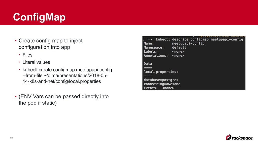 app ‣ Files ‣ Literal values ‣ kubectl create configmap meetupapi-config --from-file ~/dima/presentations/2018-05- 14-k8s-and-net/config/local.properties • (ENV Vars can be passed directly into the pod if static)