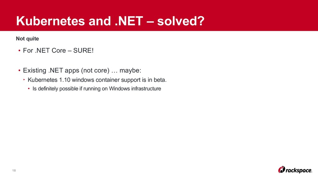 .NET Core – SURE! • Existing .NET apps (not core) … maybe: ‣ Kubernetes 1.10 windows container support is in beta. • Is definitely possible if running on Windows infrastructure