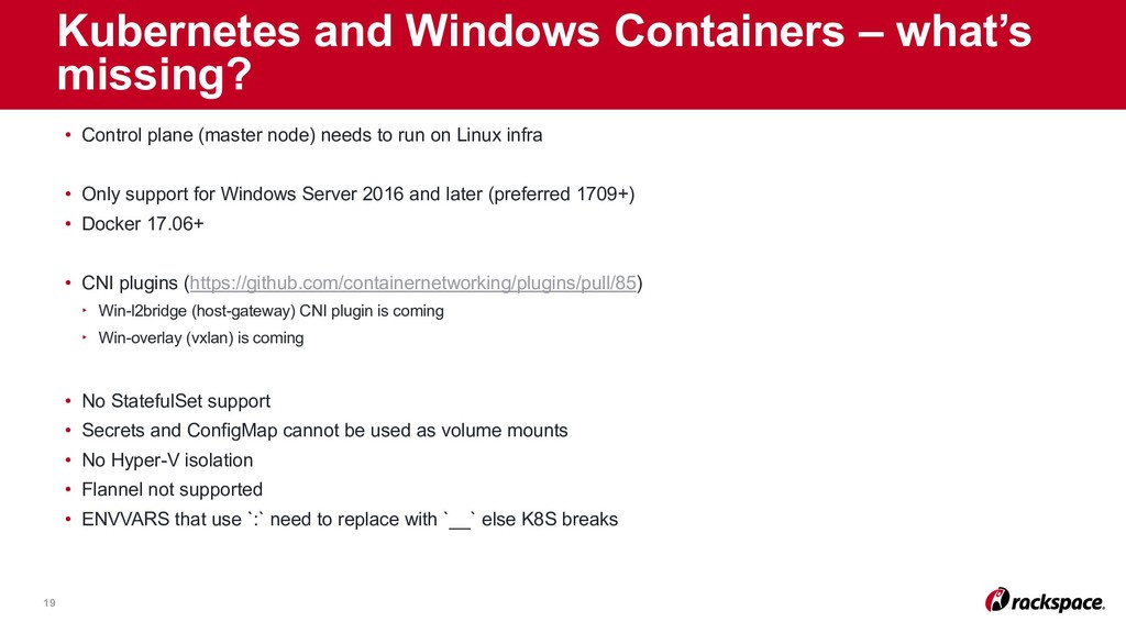 plane (master node) needs to run on Linux infra • Only support for Windows Server 2016 and later (preferred 1709+) • Docker 17.06+ • CNI plugins (https://github.com/containernetworking/plugins/pull/85) ‣ Win-l2bridge (host-gateway) CNI plugin is coming ‣ Win-overlay (vxlan) is coming • No StatefulSet support • Secrets and ConfigMap cannot be used as volume mounts • No Hyper-V isolation • Flannel not supported • ENVVARS that use `:` need to replace with `__` else K8S breaks