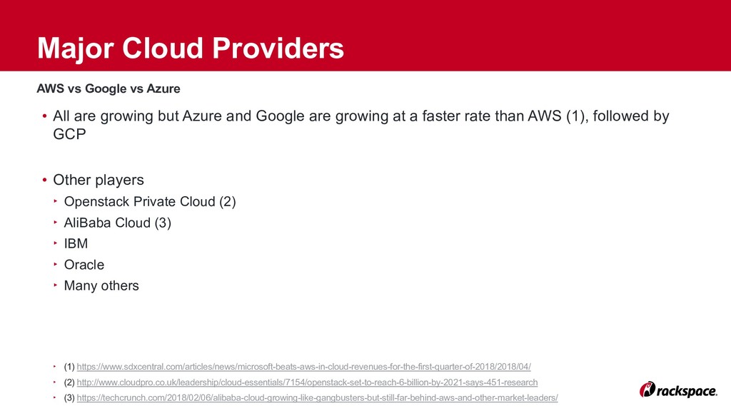 are growing but Azure and Google are growing at a faster rate than AWS (1), followed by GCP • Other players ‣ Openstack Private Cloud (2) ‣ AliBaba Cloud (3) ‣ IBM ‣ Oracle ‣ Many others ‣ (1) https://www.sdxcentral.com/articles/news/microsoft-beats-aws-in-cloud-revenues-for-the-first-quarter-of-2018/2018/04/ ‣ (2) http://www.cloudpro.co.uk/leadership/cloud-essentials/7154/openstack-set-to-reach-6-billion-by-2021-says-451-research ‣ (3) https://techcrunch.com/2018/02/06/alibaba-cloud-growing-like-gangbusters-but-still-far-behind-aws-and-other-market-leaders/