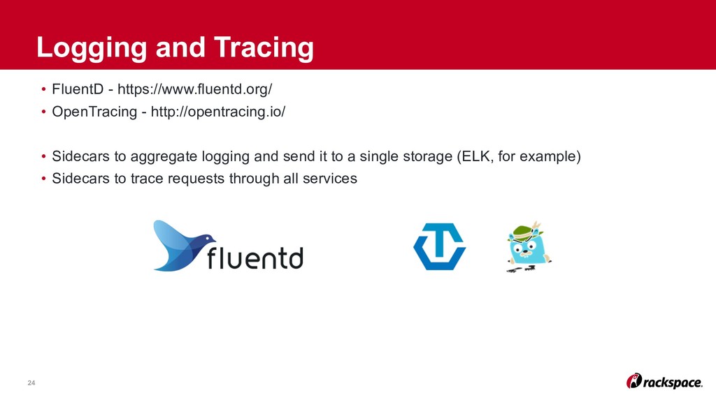 - http://opentracing.io/ • Sidecars to aggregate logging and send it to a single storage (ELK, for example) • Sidecars to trace requests through all services