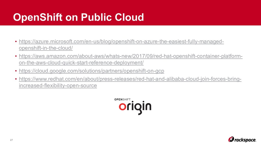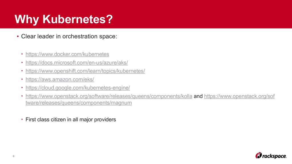 https://www.docker.com/kubernetes ‣ https://docs.microsoft.com/en-us/azure/aks/ ‣ https://www.openshift.com/learn/topics/kubernetes/ ‣ https://aws.amazon.com/eks/ ‣ https://cloud.google.com/kubernetes-engine/ ‣ https://www.openstack.org/software/releases/queens/components/kolla and https://www.openstack.org/sof tware/releases/queens/components/magnum ‣ First class citizen in all major providers