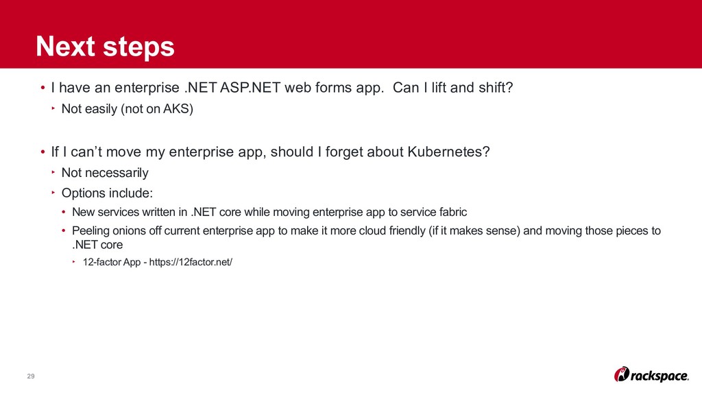 web forms app. Can I lift and shift? ‣ Not easily (not on AKS) • If I can’t move my enterprise app, should I forget about Kubernetes? ‣ Not necessarily ‣ Options include: • New services written in .NET core while moving enterprise app to service fabric • Peeling onions off current enterprise app to make it more cloud friendly (if it makes sense) and moving those pieces to .NET core ‣ 12-factor App - https://12factor.net/
