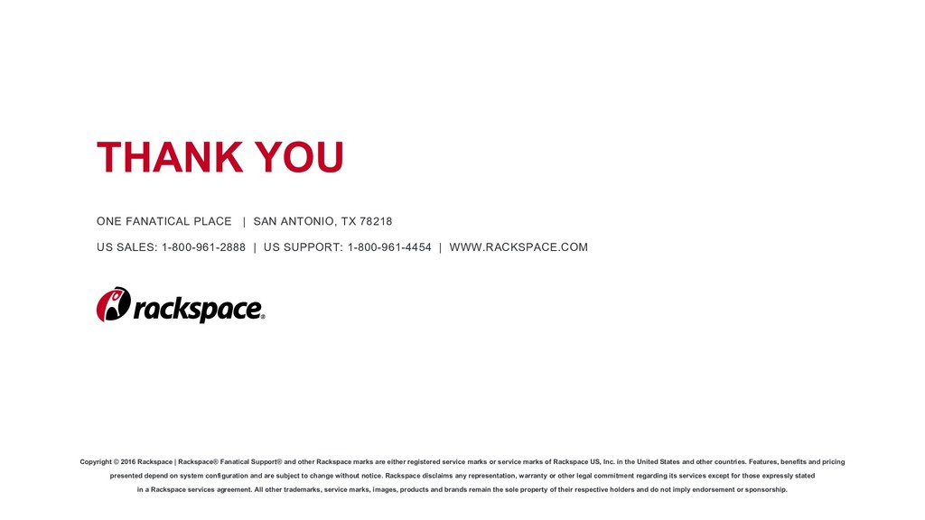 Rackspace marks are either registered service marks or service marks of Rackspace US, Inc. in the United States and other countries. Features, benefits and pricing presented depend on system configuration and are subject to change without notice. Rackspace disclaims any representation, warranty or other legal commitment regarding its services except for those expressly stated in a Rackspace services agreement. All other trademarks, service marks, images, products and brands remain the sole property of their respective holders and do not imply endorsement or sponsorship. THANK YOU ONE FANATICAL PLACE | SAN ANTONIO, TX 78218 US SALES: 1-800-961-2888 | US SUPPORT: 1-800-961-4454 | WWW.RACKSPACE.COM