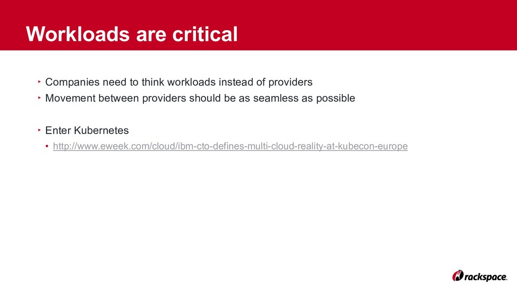 of providers ‣ Movement between providers should be as seamless as possible ‣ Enter Kubernetes • http://www.eweek.com/cloud/ibm-cto-defines-multi-cloud-reality-at-kubecon-europe
