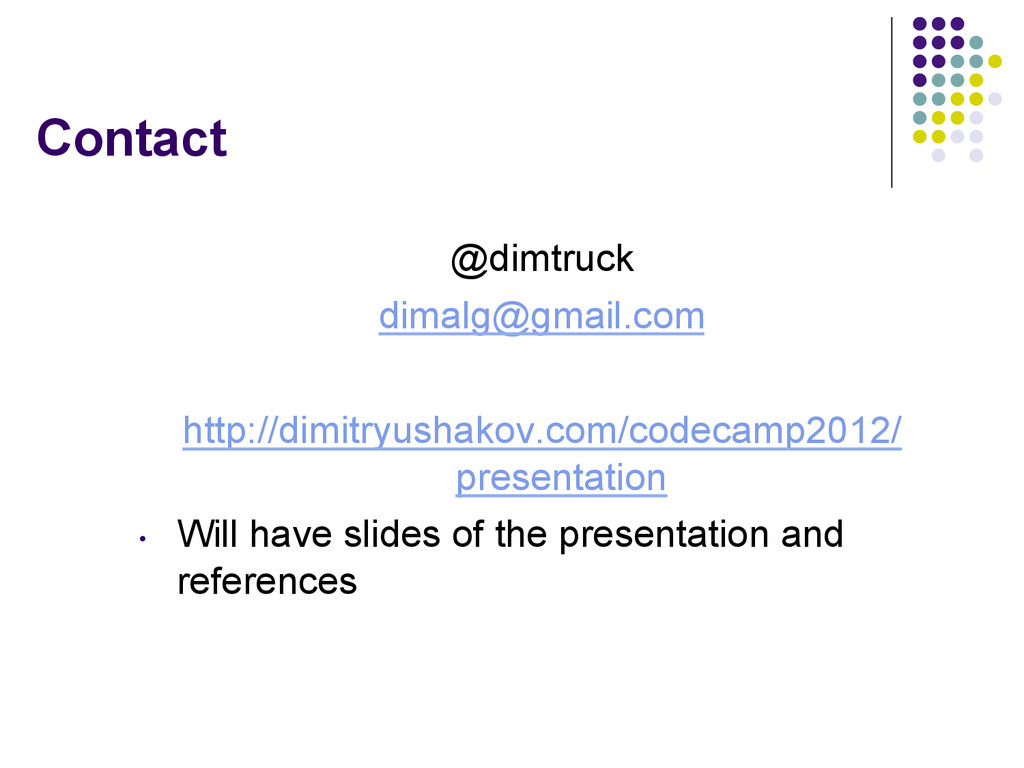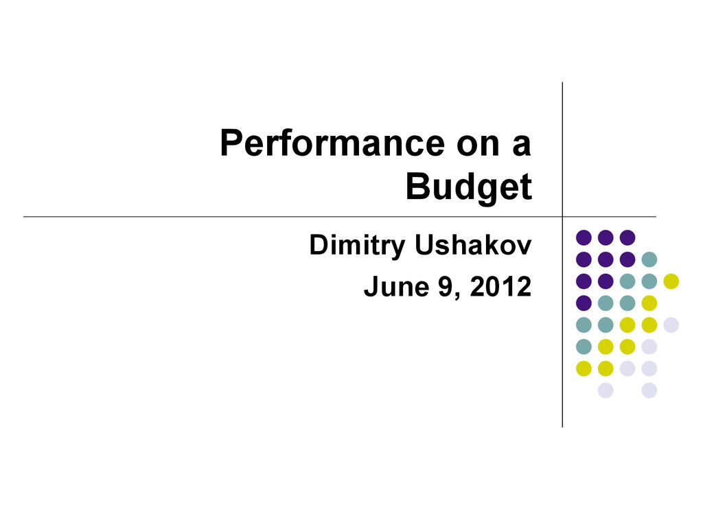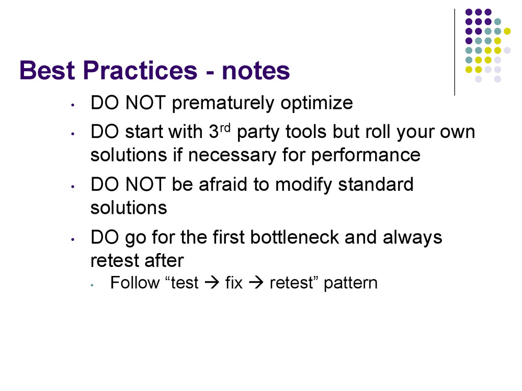 DO start with 3rd party tools but roll your own solutions if necessary for performance • DO NOT be afraid to modify standard solutions • DO go for the first bottleneck and always retest after • Follow “test à fix à retest” pattern