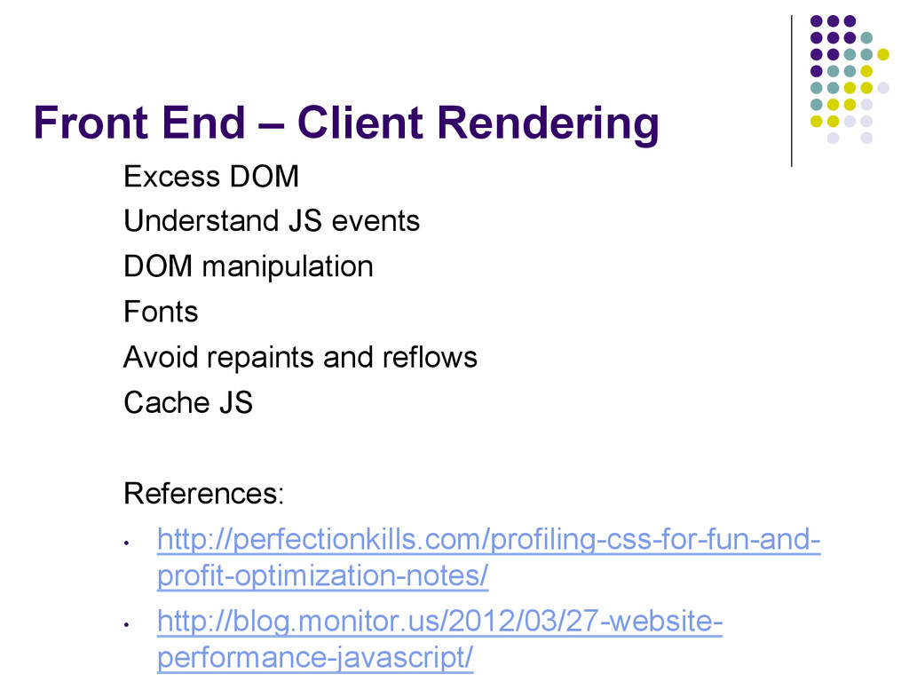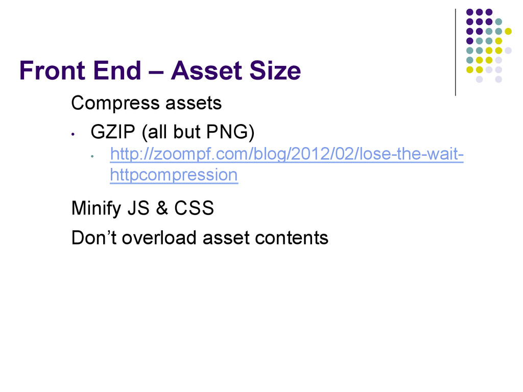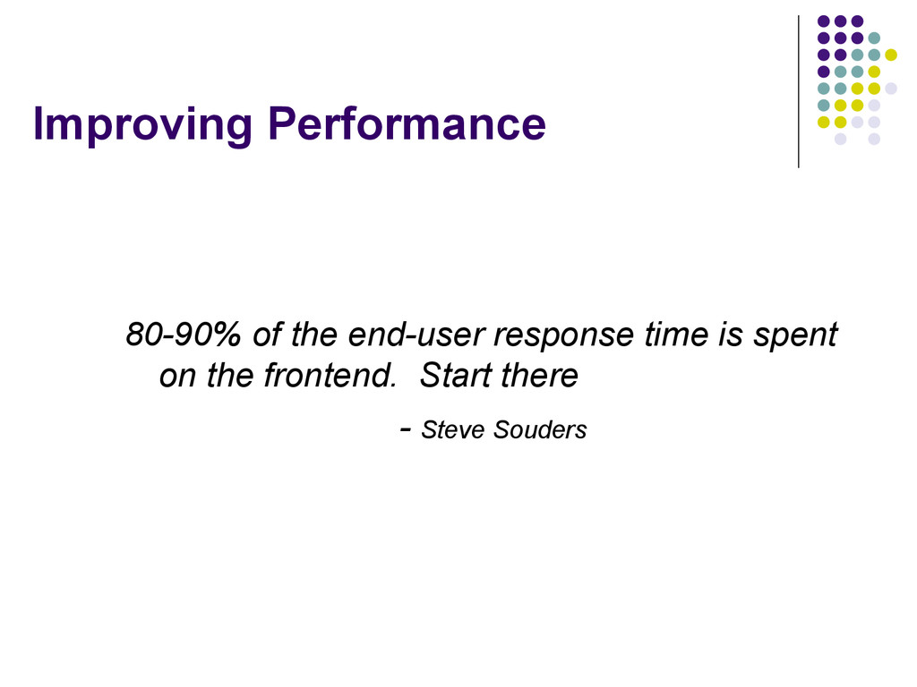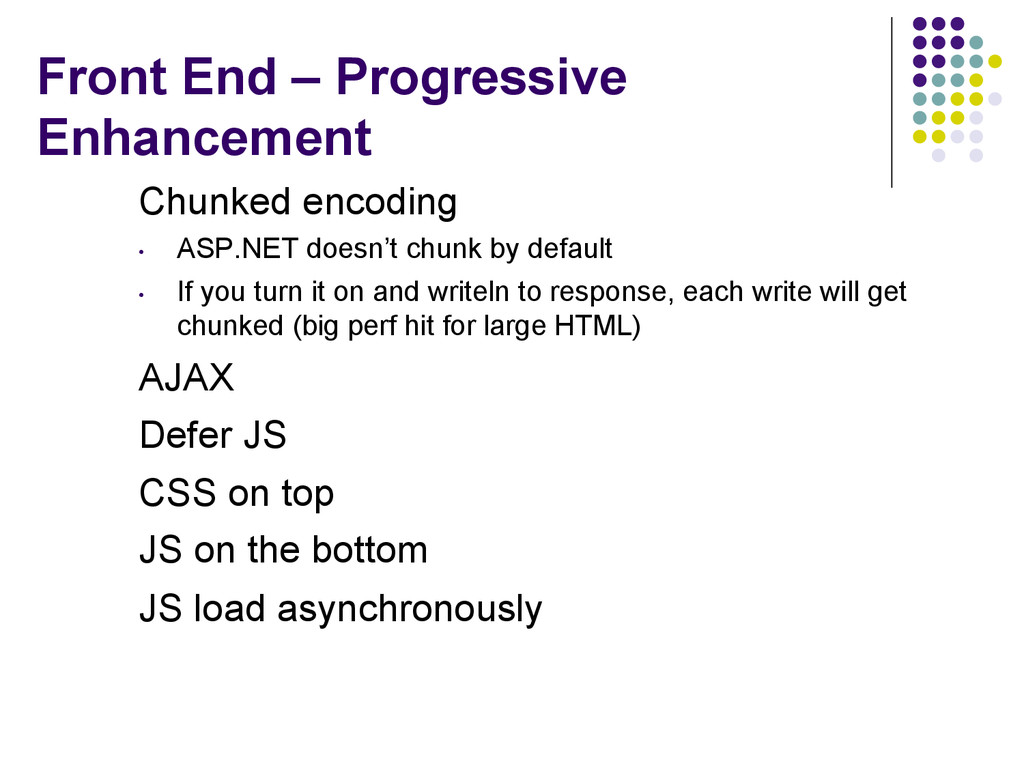 chunk by default • If you turn it on and writeln to response, each write will get chunked (big perf hit for large HTML) AJAX Defer JS CSS on top JS on the bottom JS load asynchronously