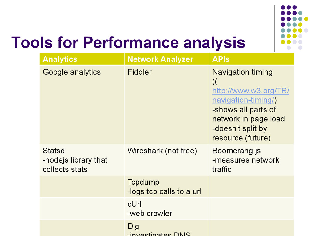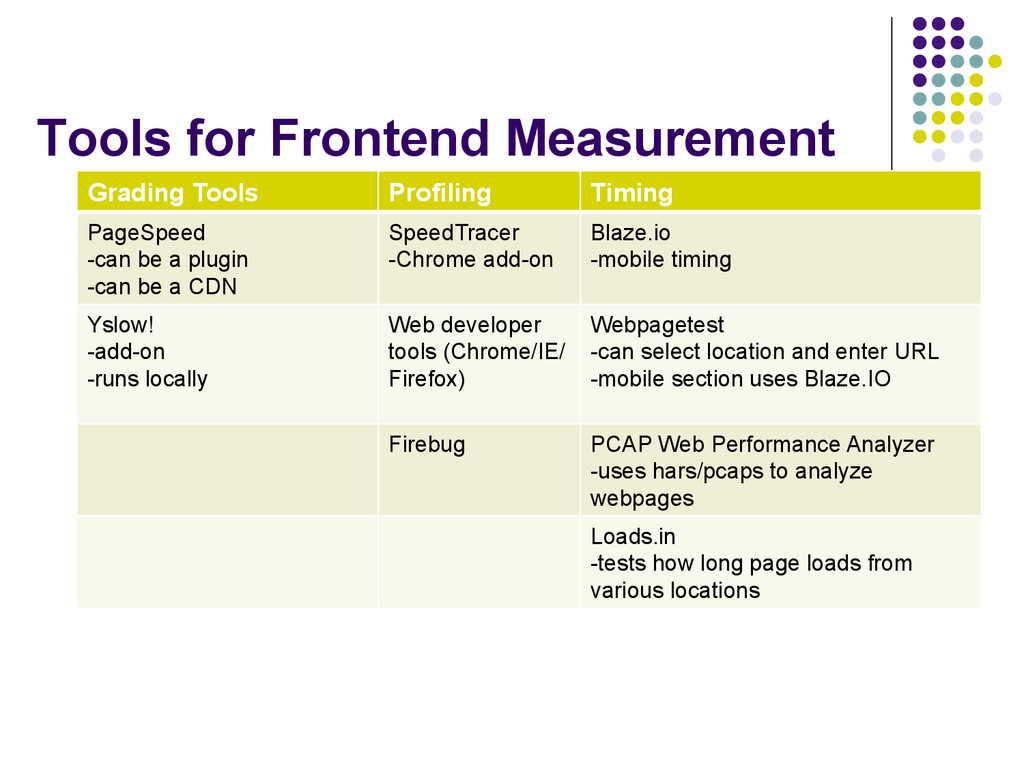 be a plugin -can be a CDN SpeedTracer -Chrome add-on Blaze.io -mobile timing Yslow! -add-on -runs locally Web developer tools (Chrome/IE/ Firefox) Webpagetest -can select location and enter URL -mobile section uses Blaze.IO Firebug PCAP Web Performance Analyzer -uses hars/pcaps to analyze webpages Loads.in -tests how long page loads from various locations